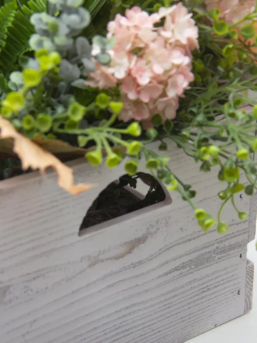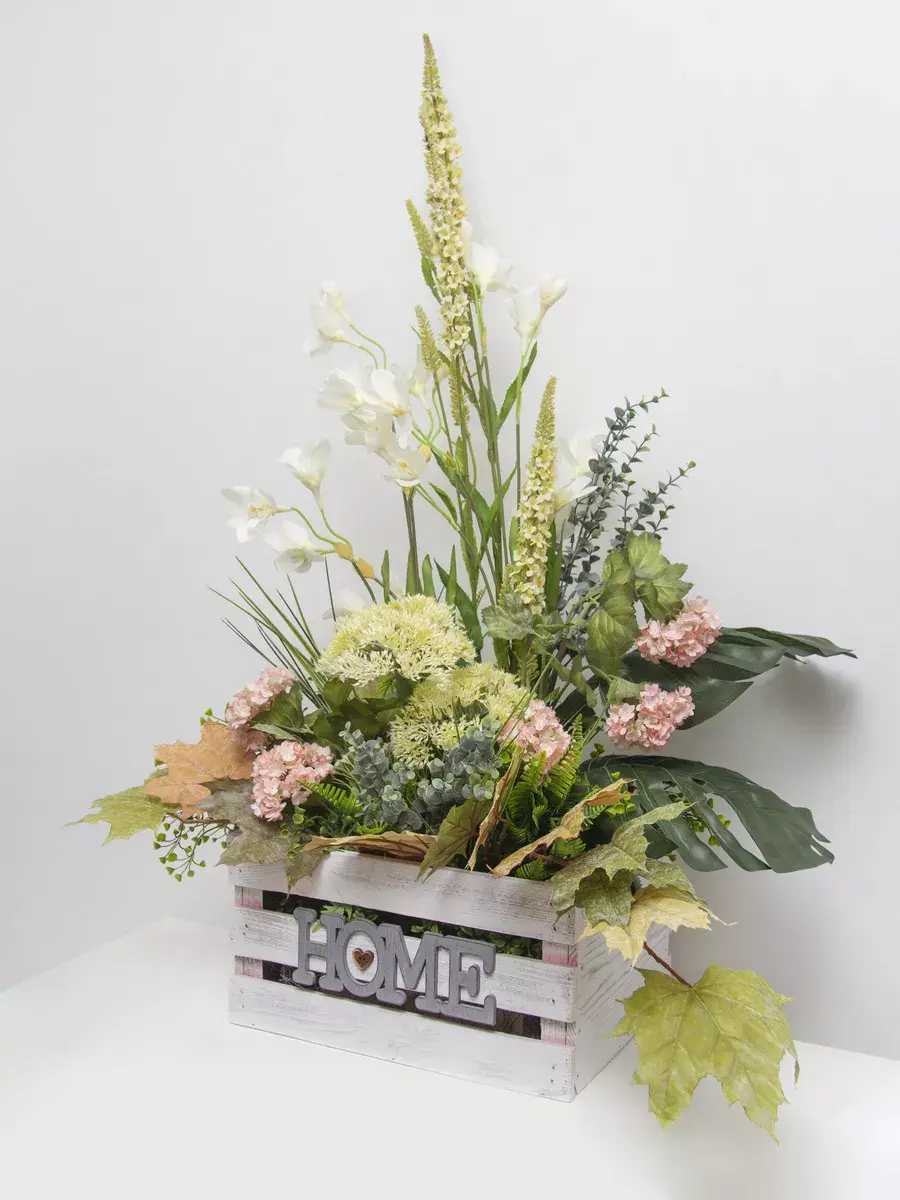 Цветочная композиция в деревянном кашпо.