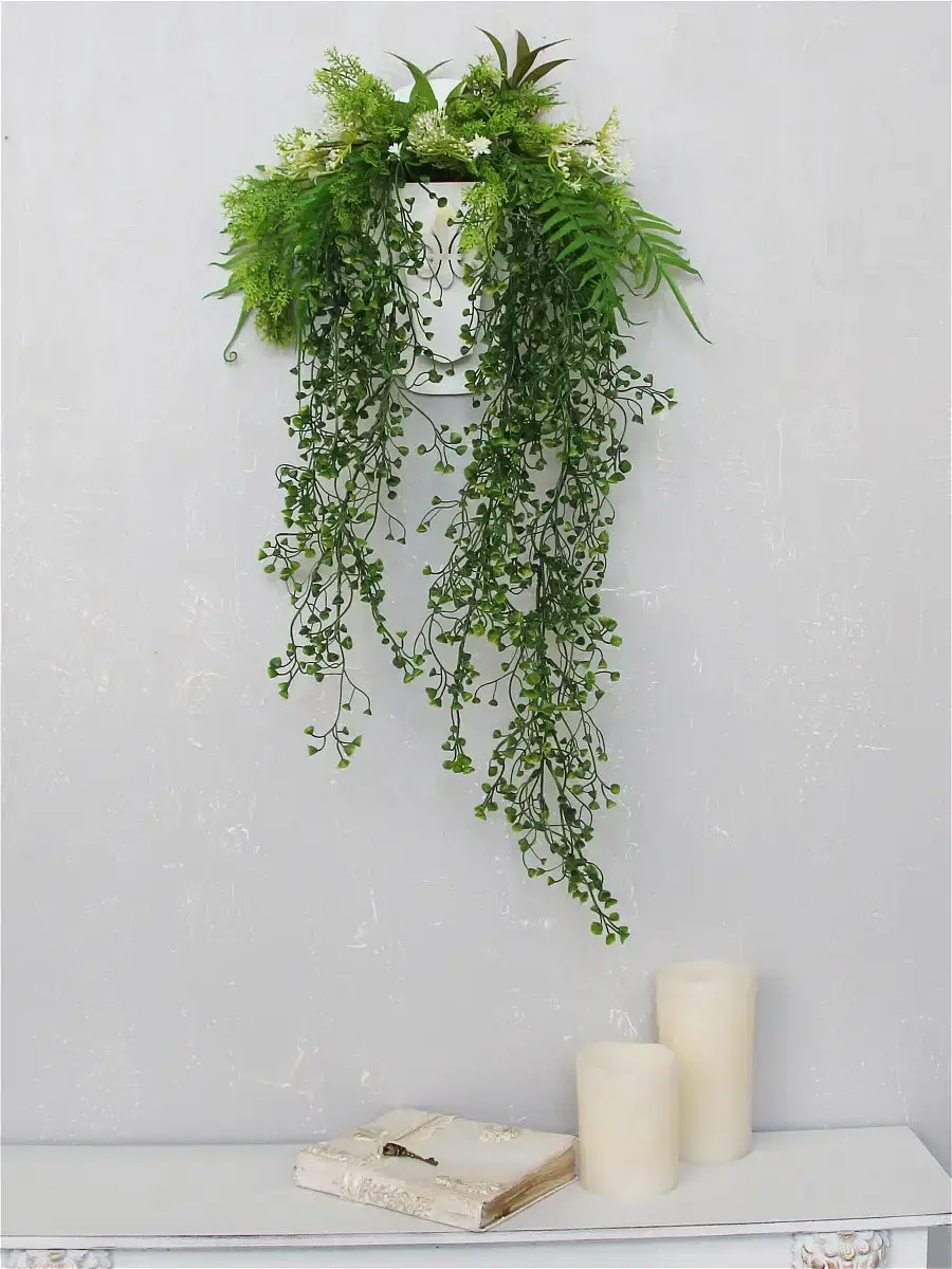 Настенная цветочная композиция в деревянном кашпо с искусственными интерьерными растениями. Выполнена из высококачественных искусственных цветов и ампельных растений , лаванда и гортензия . Размер рамы 25*17 см. В комплекте крепление на стену, шуруп с дюбелем и зубчатый крепеж на кашпо. Отличное украшение к зеркалу, коллекции картин с цветами или в прихожей, где живым цветам недостаточно света. Панно долго будет радовать и добавлять уюта в дом.