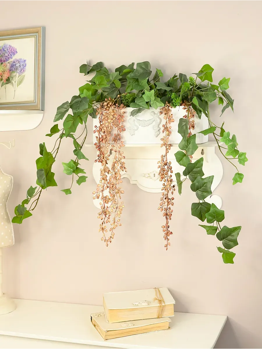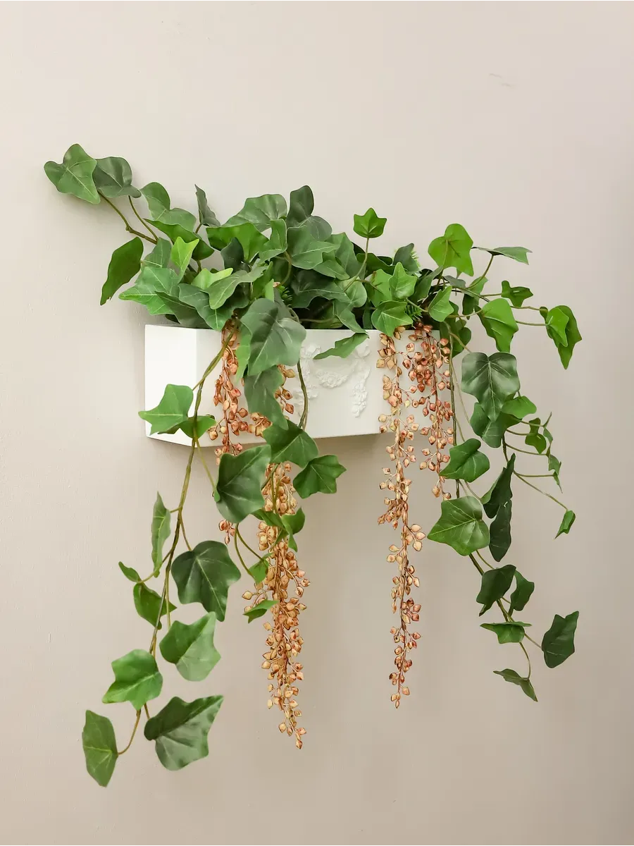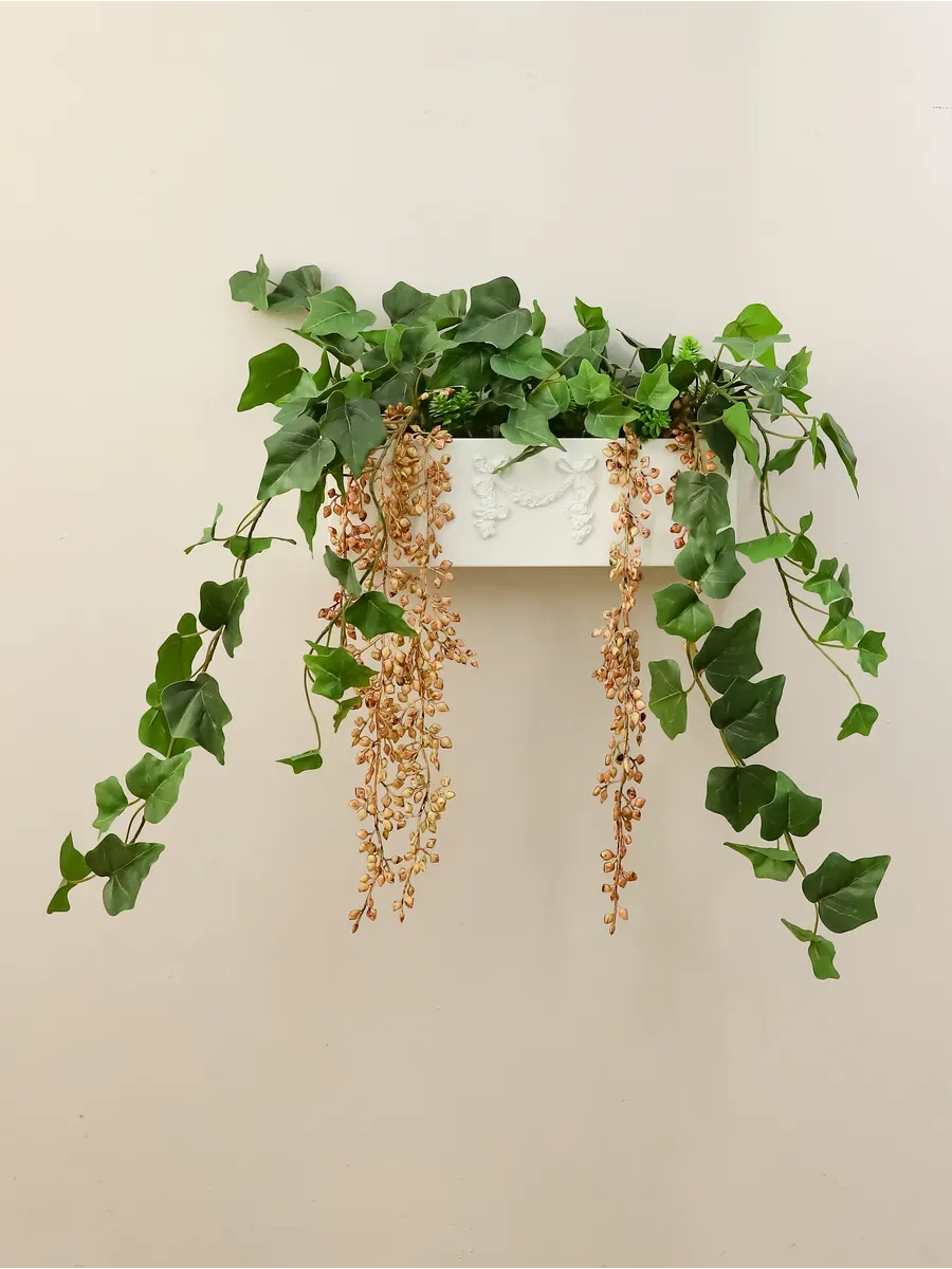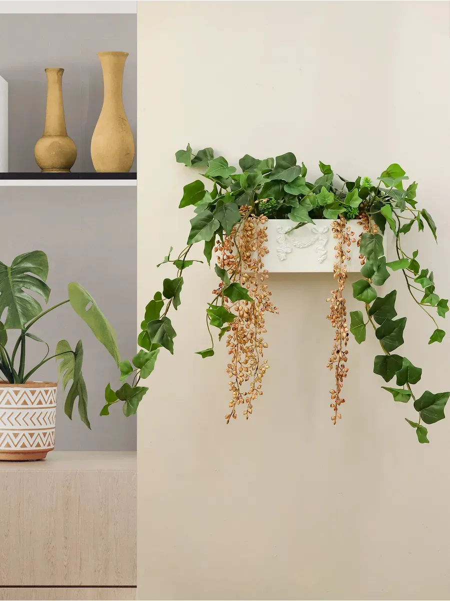 Элегантная композиция из искусственного папоротника и плюща выглядит максимально реалистично и создает эффект живых растений. Длинные ниспадающие ветви красиво спадают вниз, создавая эффект вертикального озеленения стены.