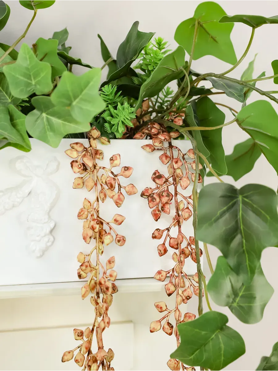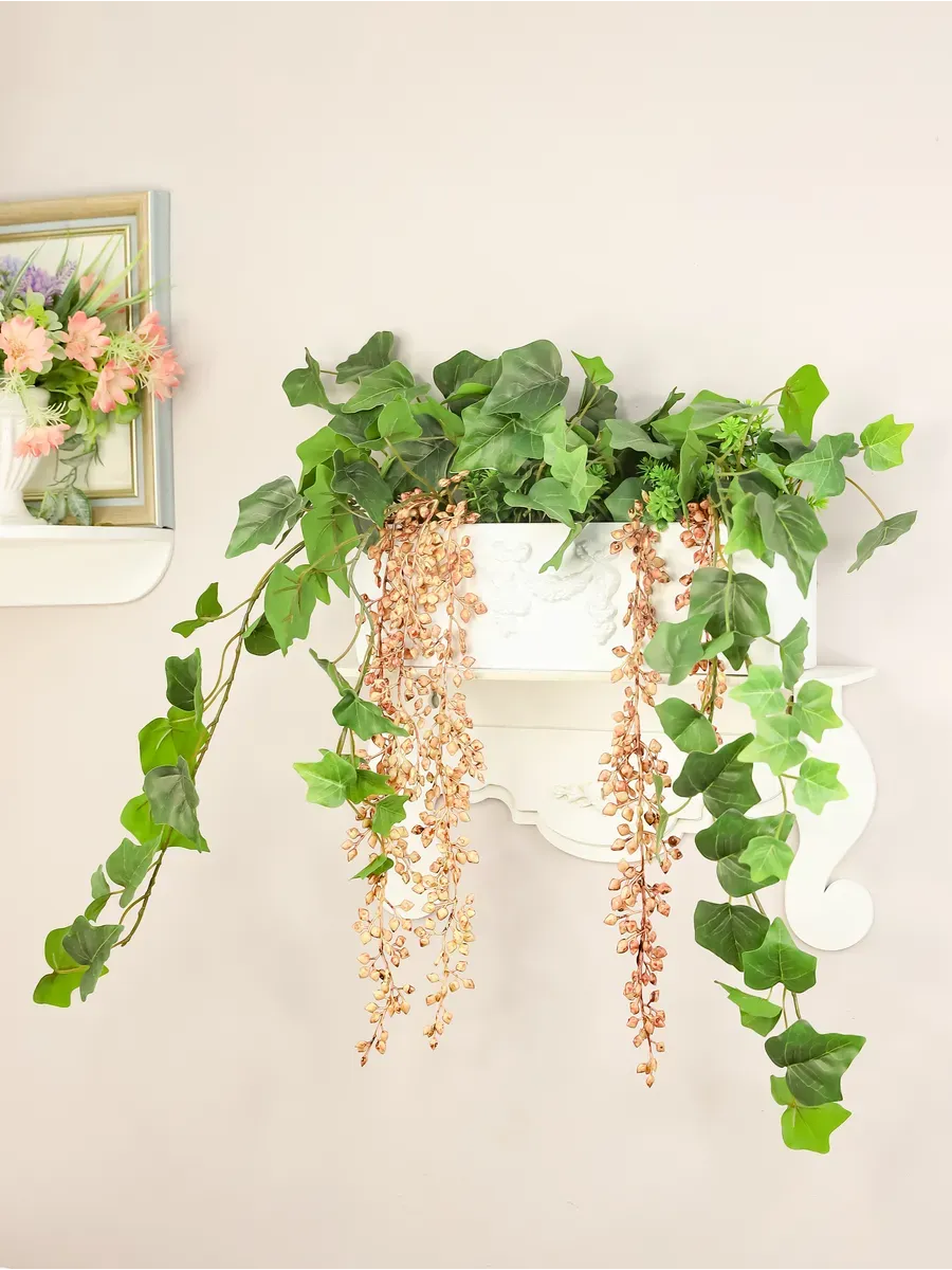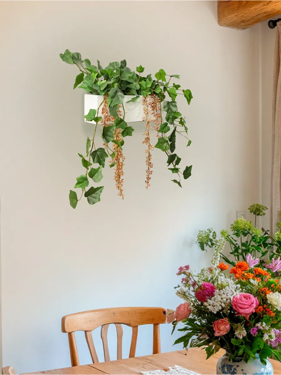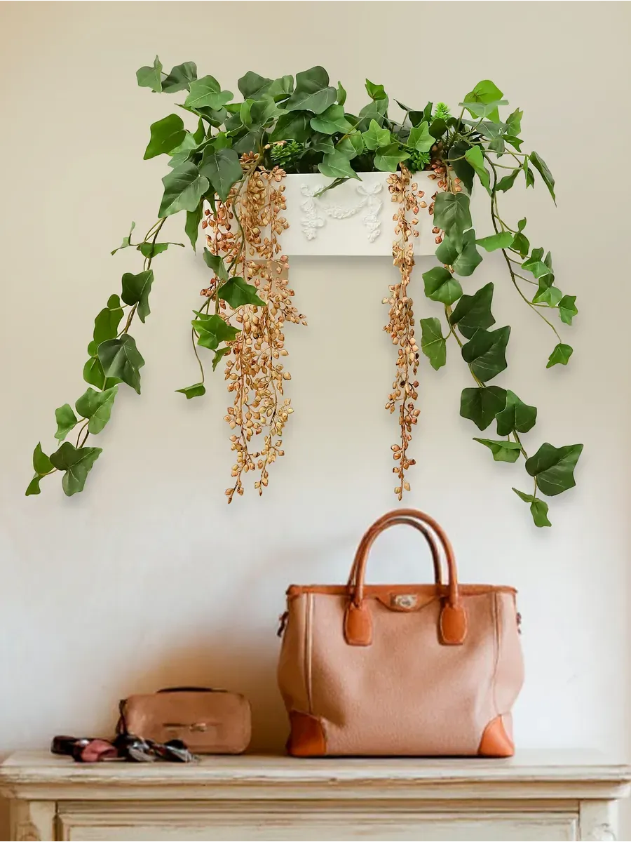 Элегантная композиция из искусственного папоротника и плюща выглядит максимально реалистично и создает эффект живых растений. Длинные ниспадающие ветви красиво спадают вниз, создавая эффект вертикального озеленения стены.