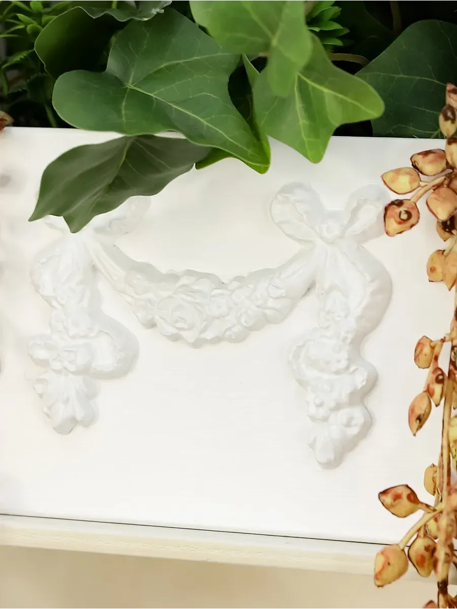 Композиция размещена в декоративном деревянном кашпо с изящной лепниной, которое подчеркивает стиль прованс и делает декор благородным и дорогим.