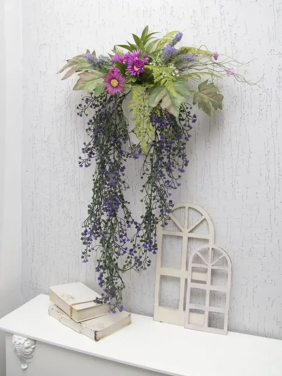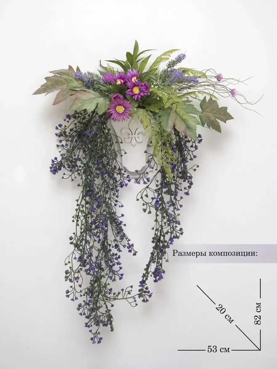 Настенная цветочная композиция в деревянном кашпо с искусственными интерьерными растениями. Настенное кашпо с искусственными цветами подойдет для интерьера дома и дачи. Выполнена из высококачественных искусственных цветов и ампельных растений , лаванда и гортензия . Размер рамы 25*17 см. В комплекте крепление на стену, шуруп с дюбелем и зубчатый крепеж на кашпо. Отличное украшение к зеркалу, коллекции картин с цветами или в прихожей, где живым цветам недостаточно света. Панно долго будет радовать и добавлять уюта в дом.