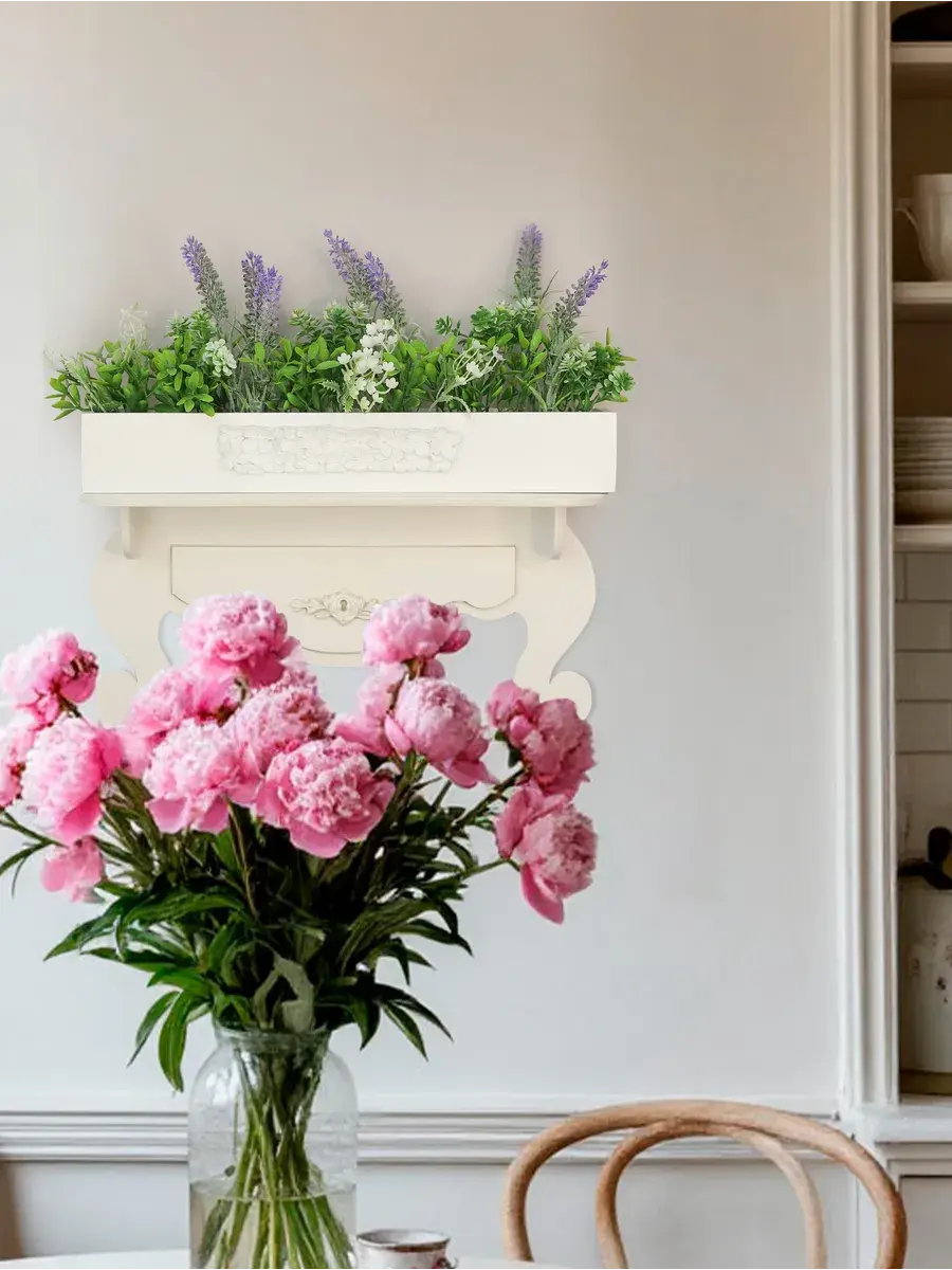 Станет прекрасным дополнением зеркала или отдельным акцентом на комоде, подоконнике, в прихожей, где живым цветам мало света. Ящик изготовлен из березовой фанеры, покрыт акриловой эмалью без запаха. Размер ящика 36*5*5,5 см. Размер композиции целиком 44*10*18 см. Цветы надежно закреплены в ящичке.