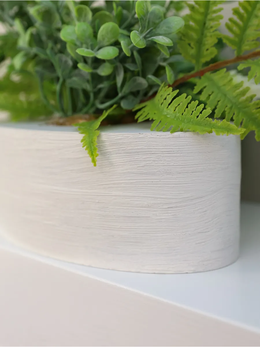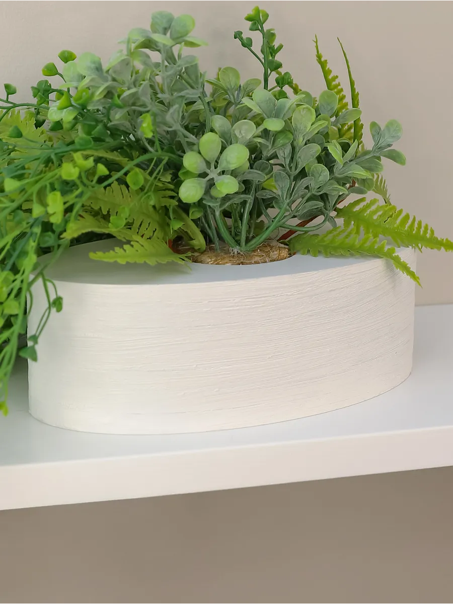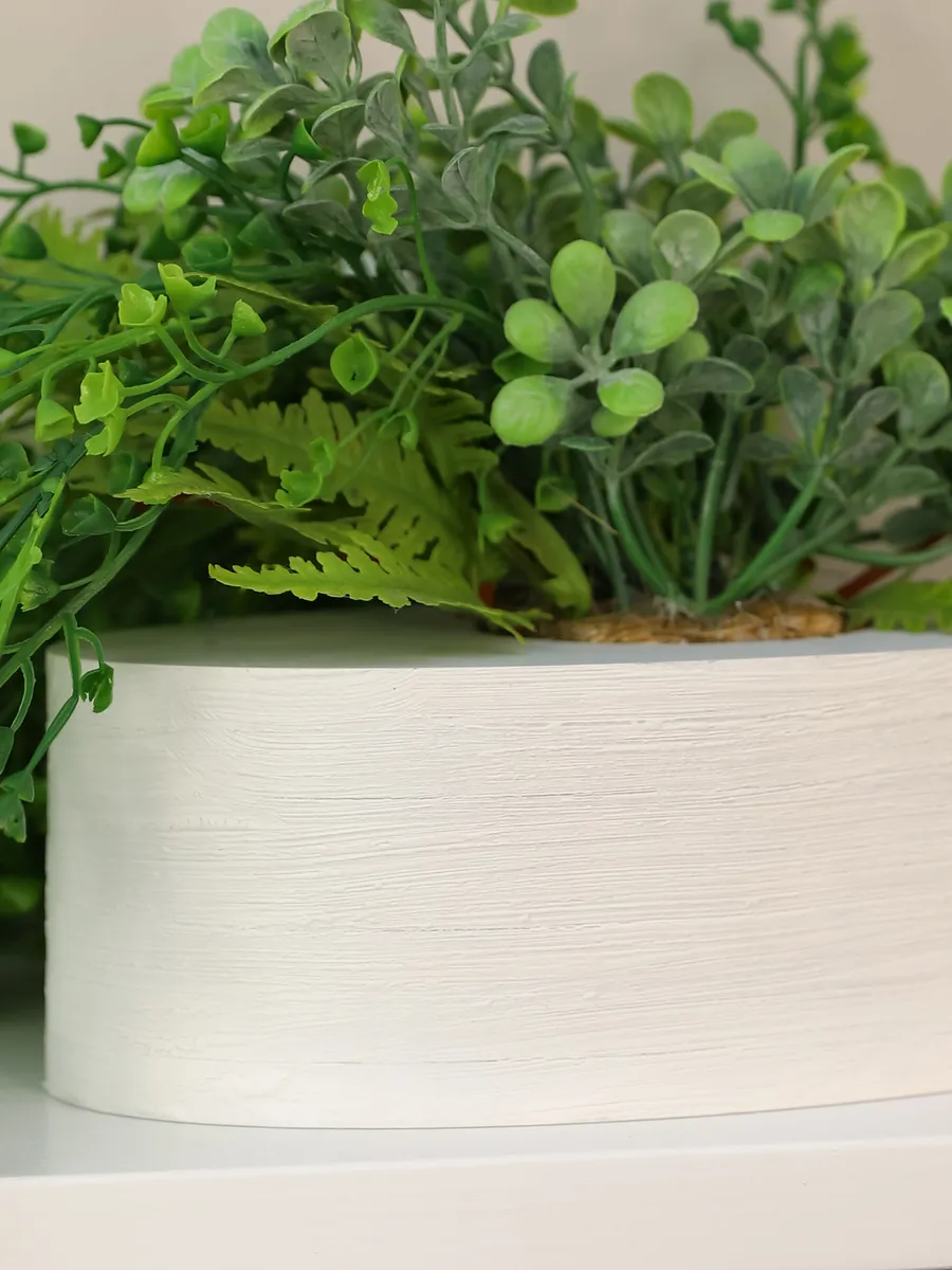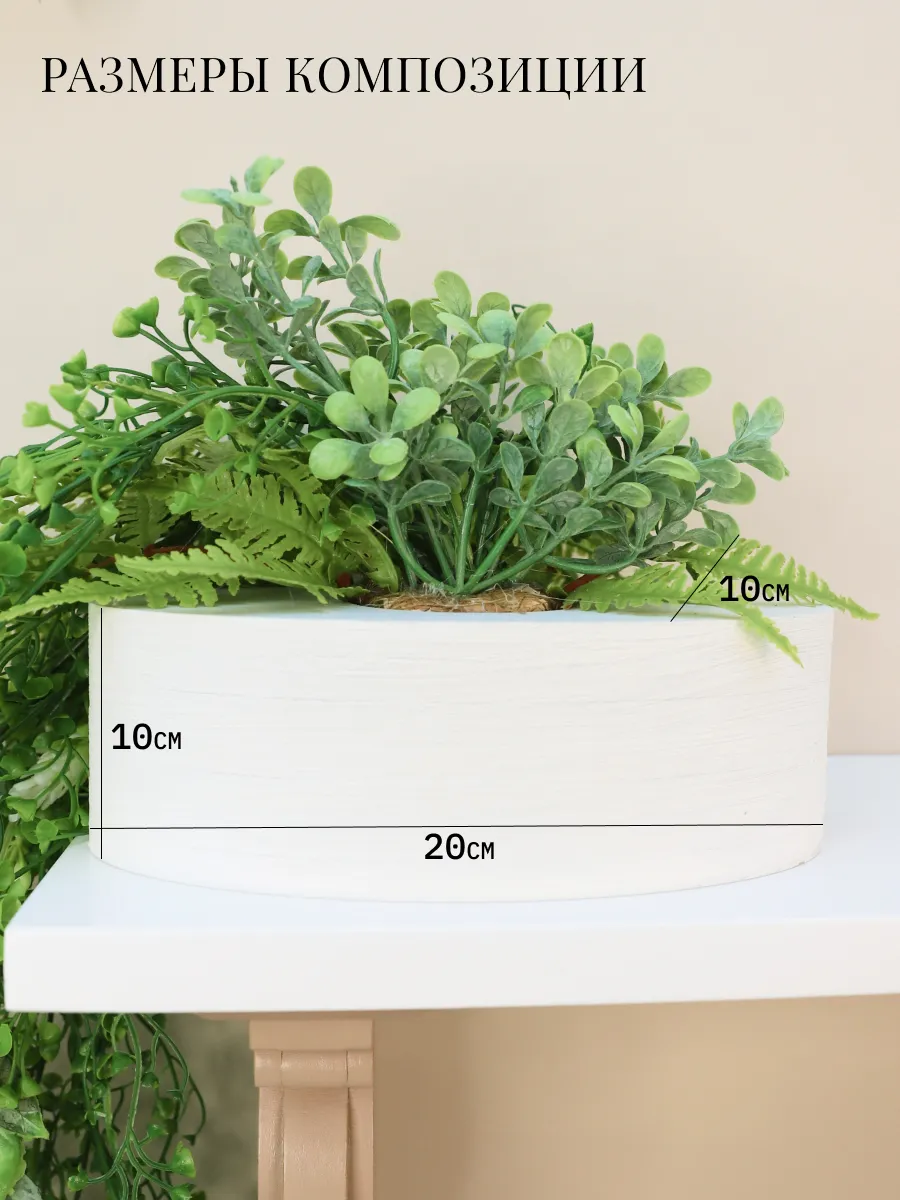 Небольшая аккуратная композиция из искусственных растений в овальном кашпо. Станет прекрасным дополнением зеркала или отдельным акцентом на комоде, подоконнике, в прихожей, где живым цветам мало света. Размер кашпо 20*10 см. Размер композиции целиком 40*60 см. Цветы надежно закреплены в ящичке.