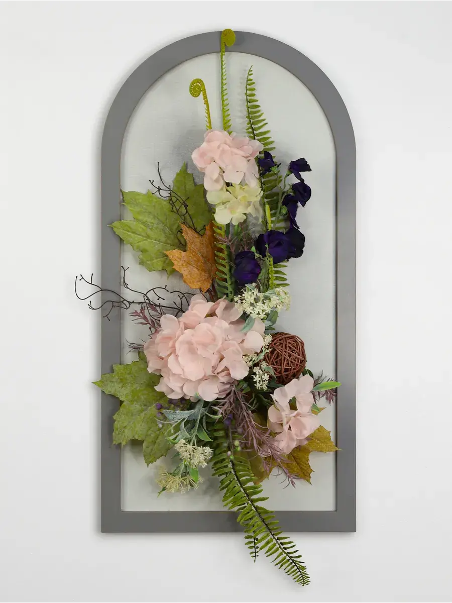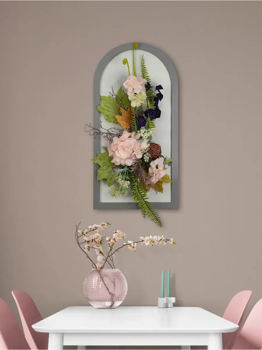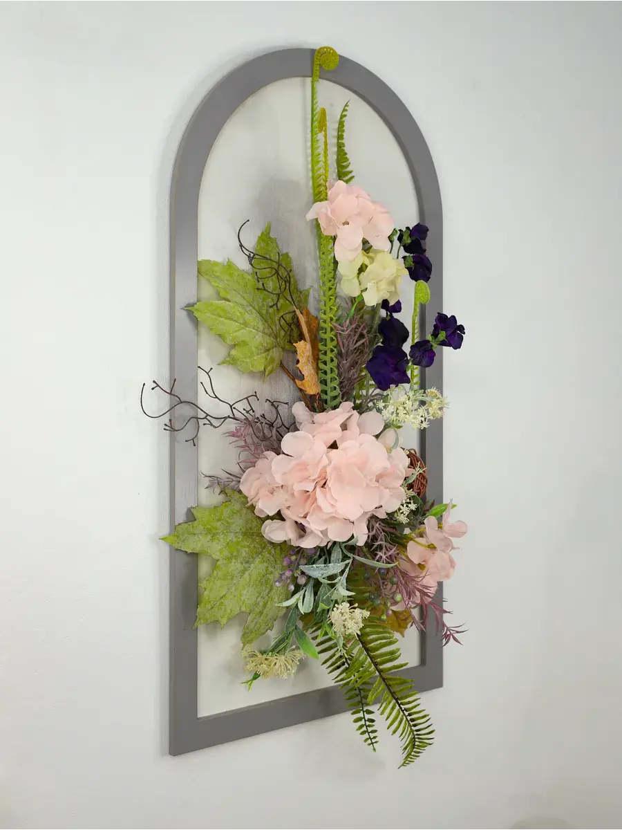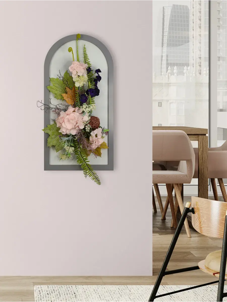 Авторская композиция из интерьерных цветов на раме в форме арки 66*32 см. Настенная цветочная композиция в форме арки с искусственными интерьерными цветами. Выполнена из высококачественных искусственных цветов и растений, лаванда и гортензия, горошек, орхидеи. В комплекте шуруп с дюбелем и зубчатый крепеж на раме. Отличное украшение к зеркалу, коллекции картин с цветами или в прихожей, где живым цветам недостаточно света. Панно долго будет радовать и добавлять уюта в дом.