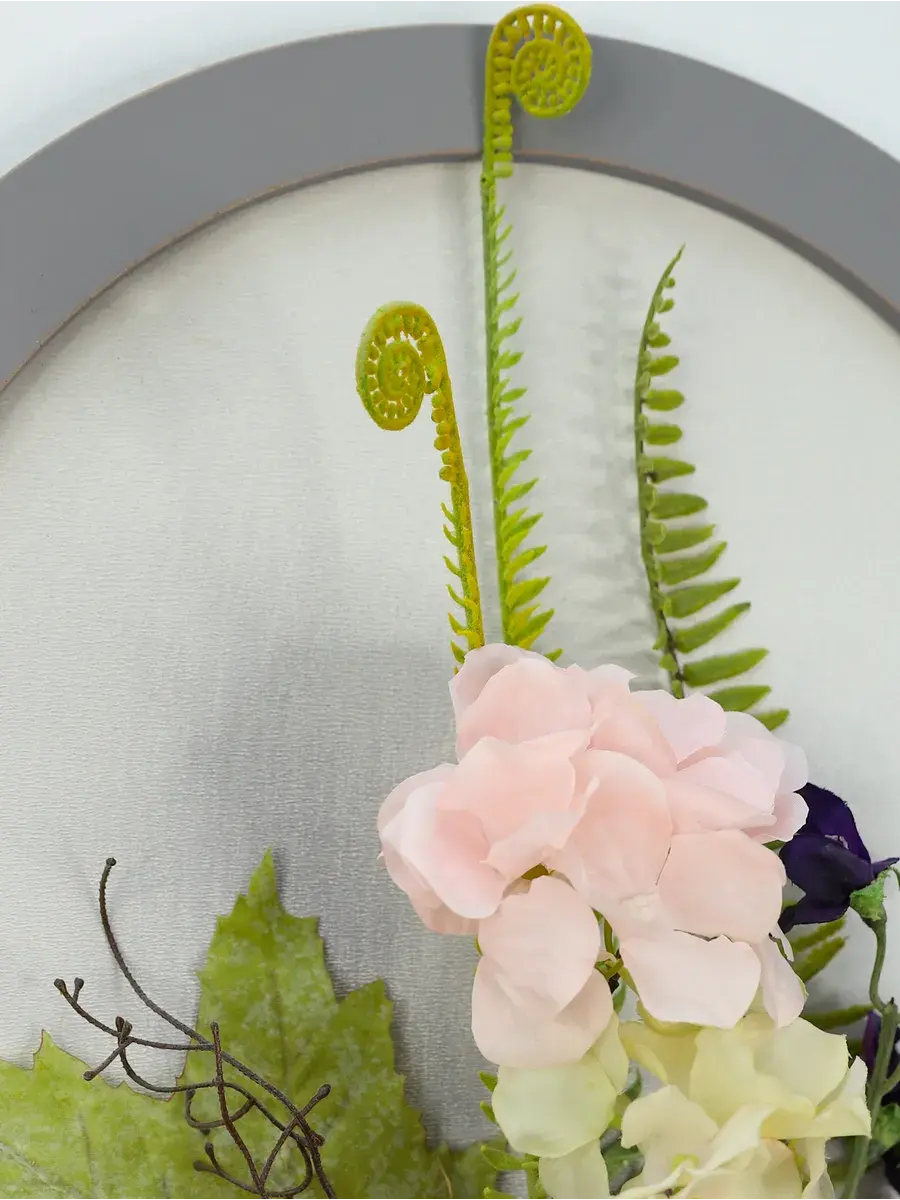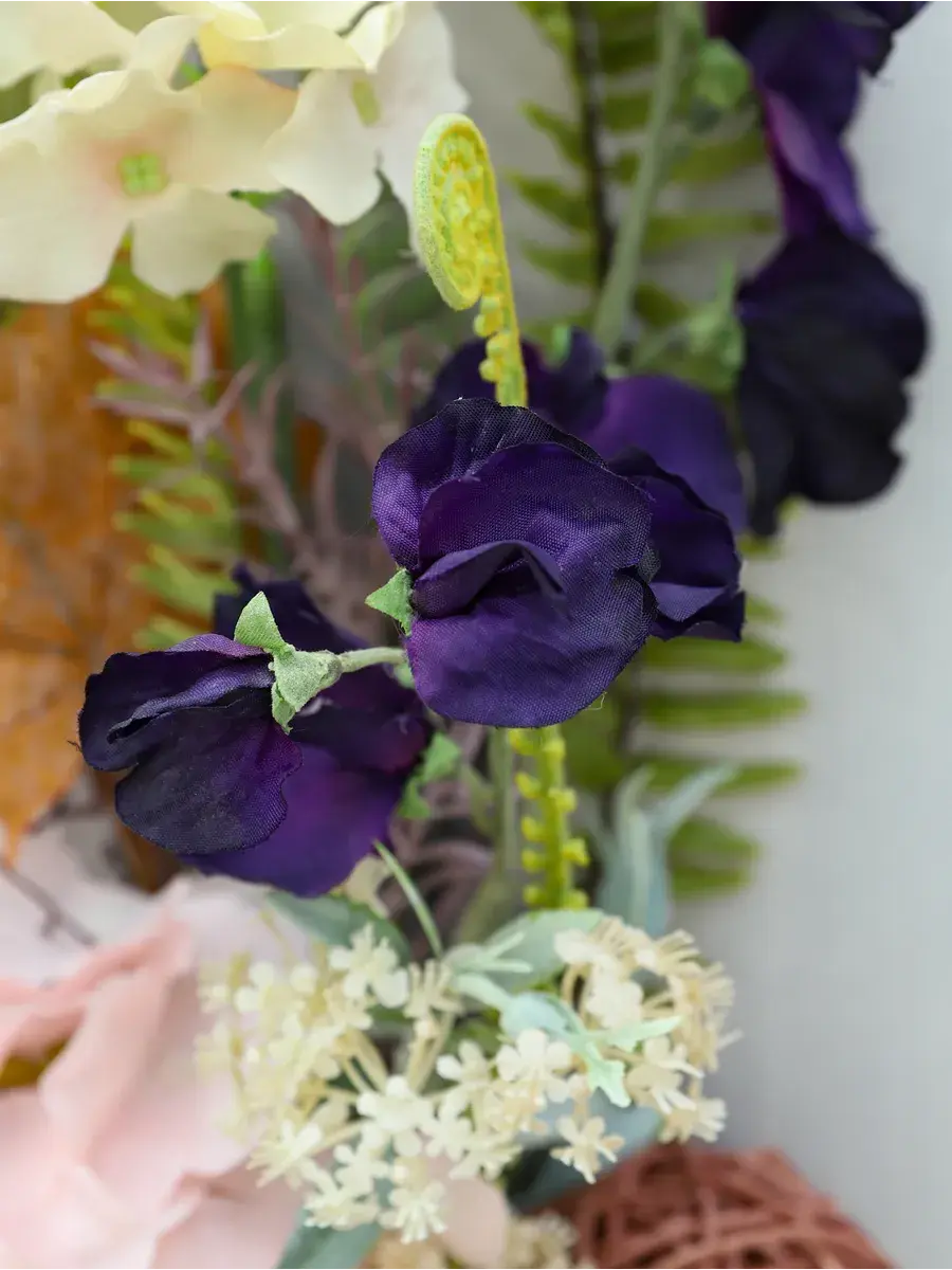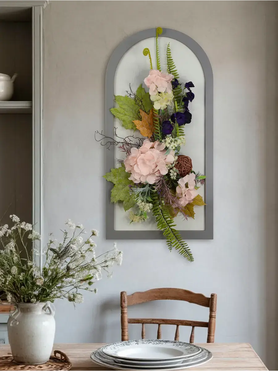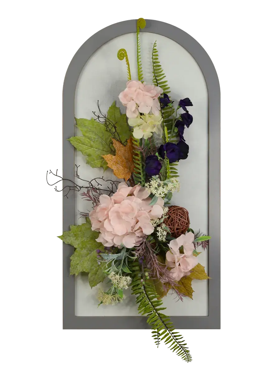 Авторская композиция из интерьерных цветов на раме в форме арки 66*32 см. Настенная цветочная композиция в форме арки с искусственными интерьерными цветами. Выполнена из высококачественных искусственных цветов и растений, лаванда и гортензия, горошек, орхидеи. В комплекте шуруп с дюбелем и зубчатый крепеж на раме. Отличное украшение к зеркалу, коллекции картин с цветами или в прихожей, где живым цветам недостаточно света. Панно долго будет радовать и добавлять уюта в дом.