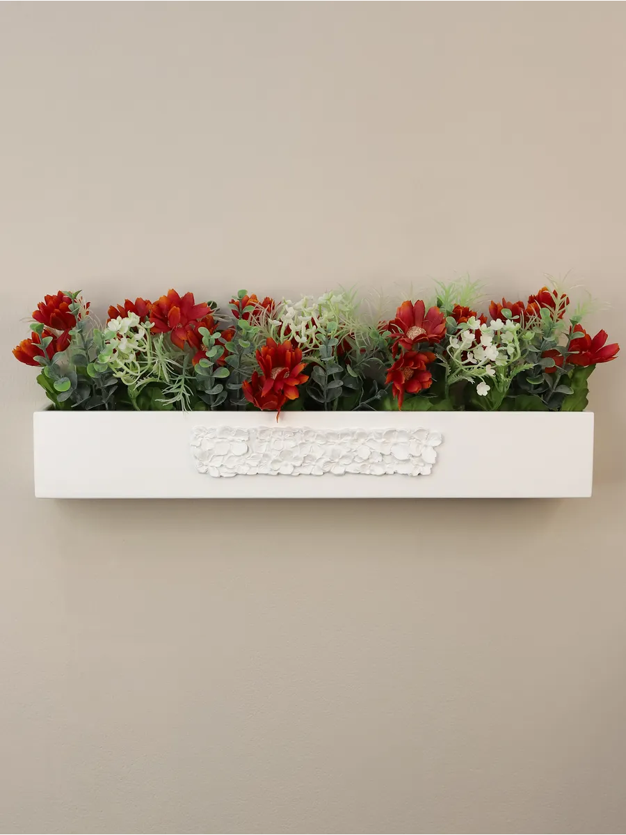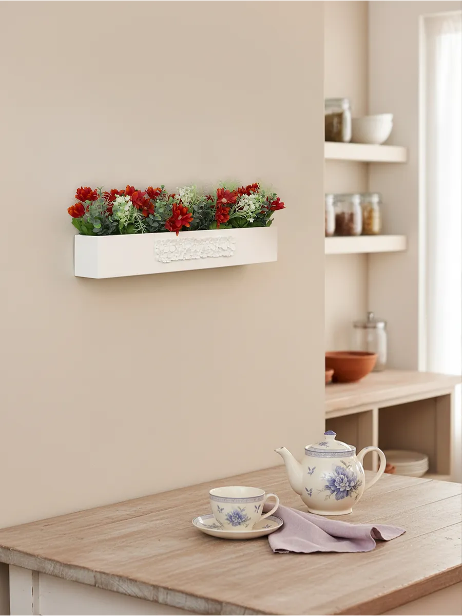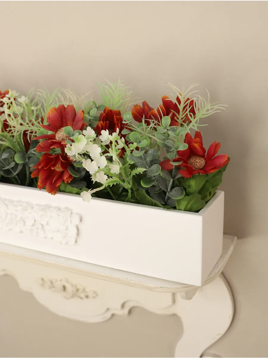 Небольшая аккуратная композиция из искусственных растений в деревянном ящике с лепниной. Станет прекрасным дополнением зеркала или отдельным акцентом на комоде, подоконнике, в прихожей, где живым цветам мало света. Ящик изготовлен из березовой фанеры, покрыт акриловой эмалью без запаха. Размер ящика 36*6*6 см. Размер композиции целиком 36*14*6 см. Цветы надежно закреплены в ящичке.