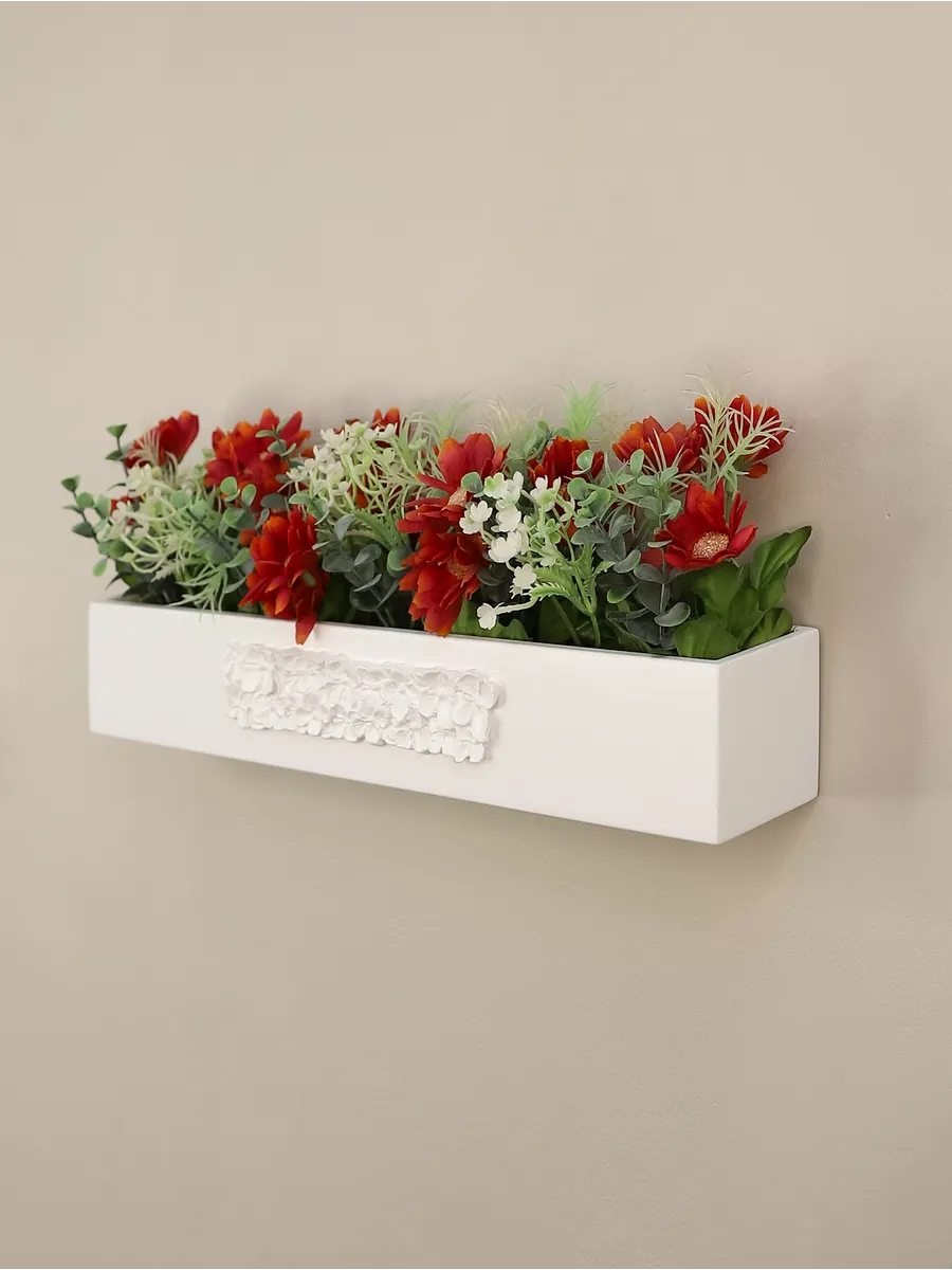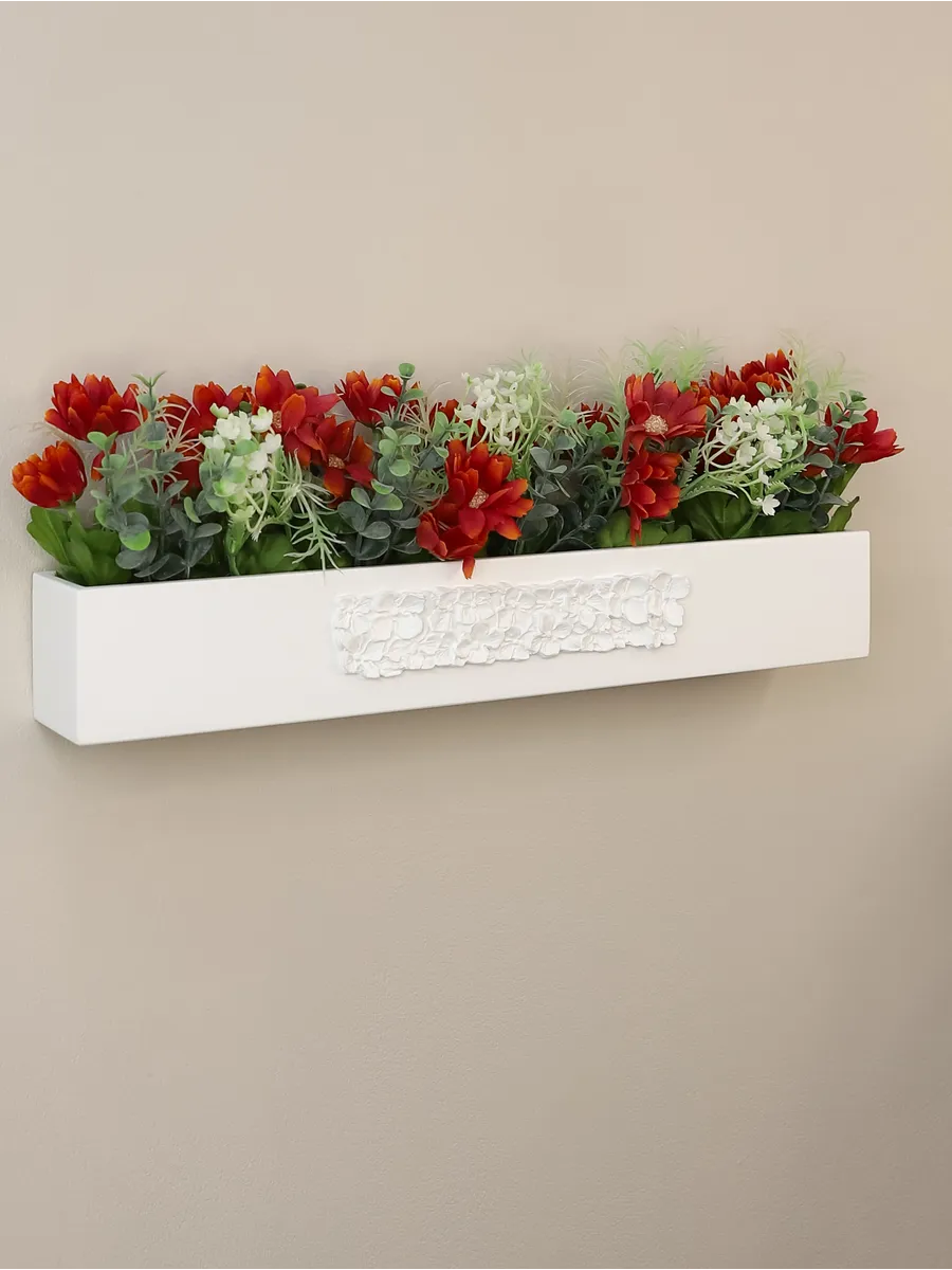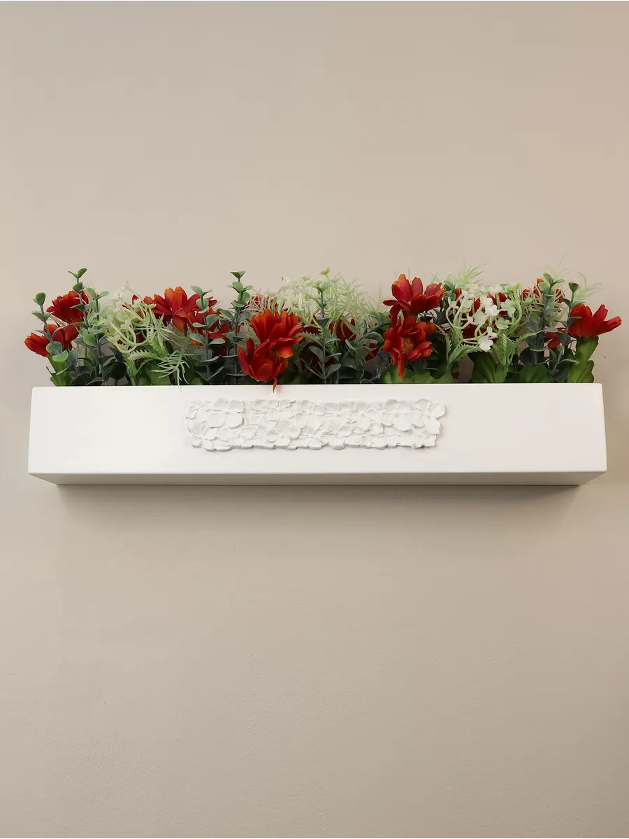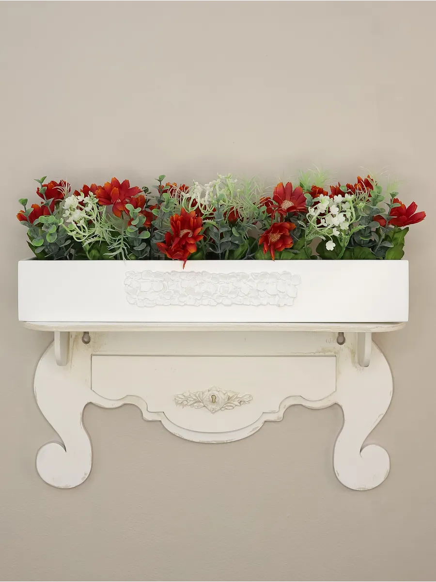 Небольшая аккуратная композиция из искусственных растений в деревянном ящике с лепниной. Станет прекрасным дополнением зеркала или отдельным акцентом на комоде, подоконнике, в прихожей, где живым цветам мало света. Ящик изготовлен из березовой фанеры, покрыт акриловой эмалью без запаха. Размер ящика 36*6*6 см. Размер композиции целиком 36*14*6 см. Цветы надежно закреплены в ящичке.