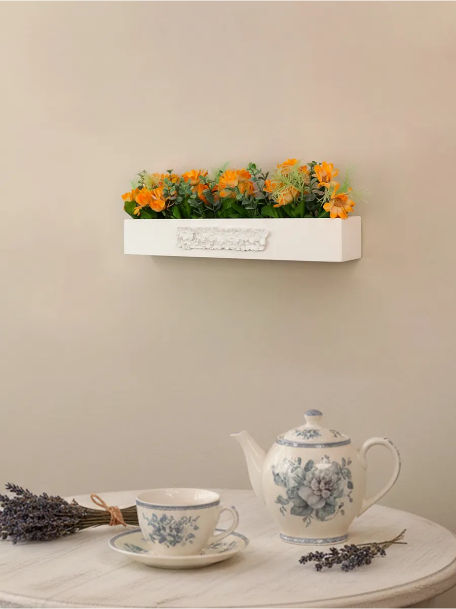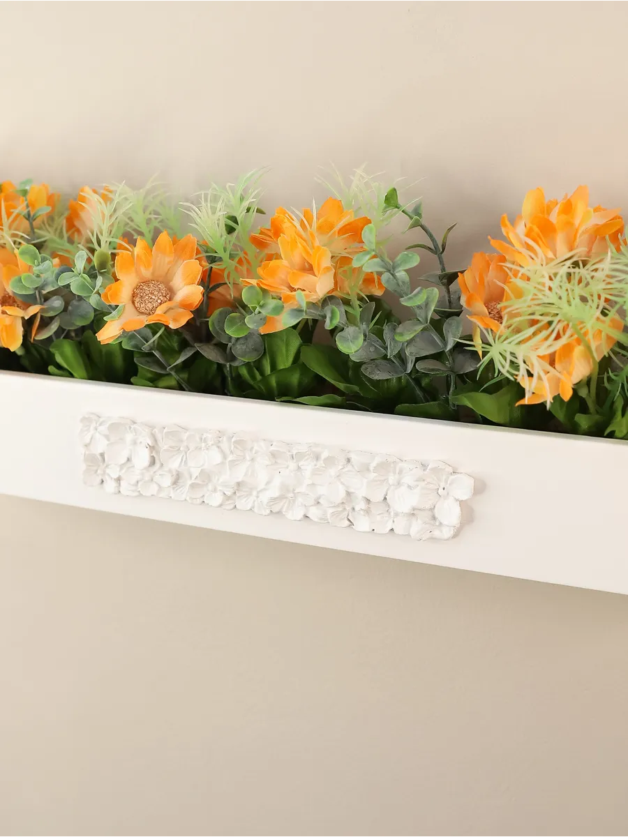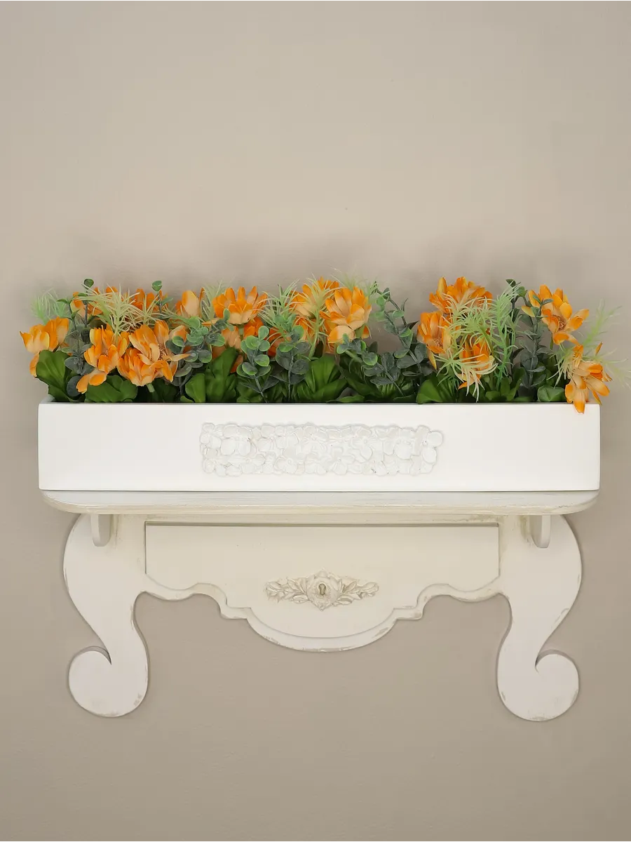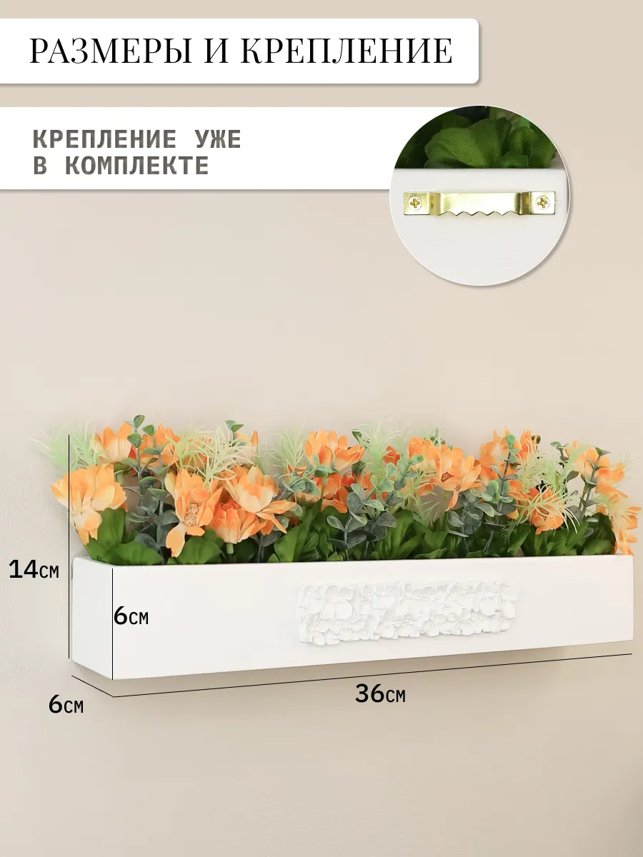 Небольшая аккуратная композиция из искусственных растений в деревянном ящике с лепниной. Станет прекрасным дополнением зеркала или отдельным акцентом на комоде, подоконнике, в прихожей, где живым цветам мало света. Ящик изготовлен из березовой фанеры, покрыт акриловой эмалью без запаха. Размер ящика 36*6*6 см. Размер композиции целиком 36*14*6 см. Цветы надежно закреплены в ящичке.