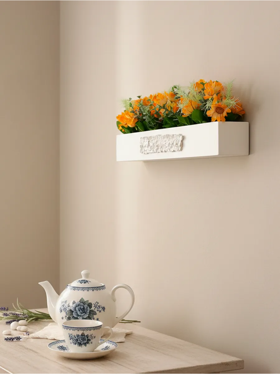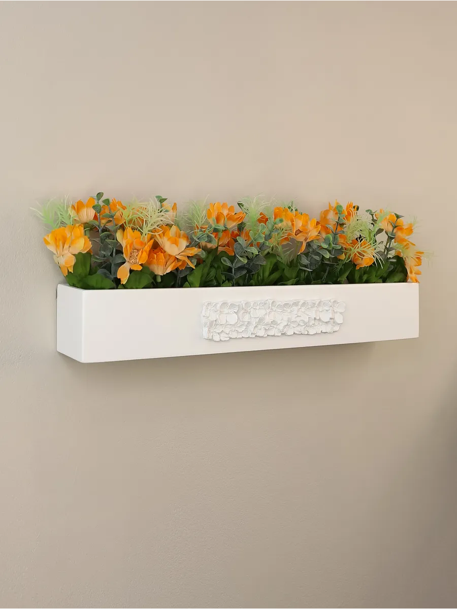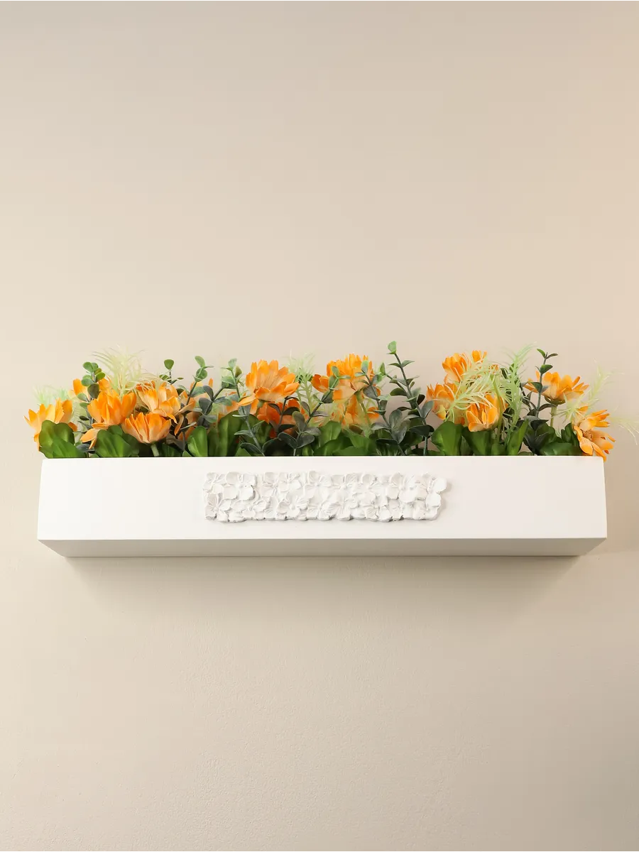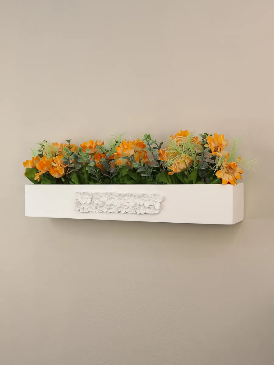 Небольшая аккуратная композиция из искусственных растений в деревянном ящике с лепниной. Станет прекрасным дополнением зеркала или отдельным акцентом на комоде, подоконнике, в прихожей, где живым цветам мало света. Ящик изготовлен из березовой фанеры, покрыт акриловой эмалью без запаха. Размер ящика 36*6*6 см. Размер композиции целиком 36*14*6 см. Цветы надежно закреплены в ящичке.