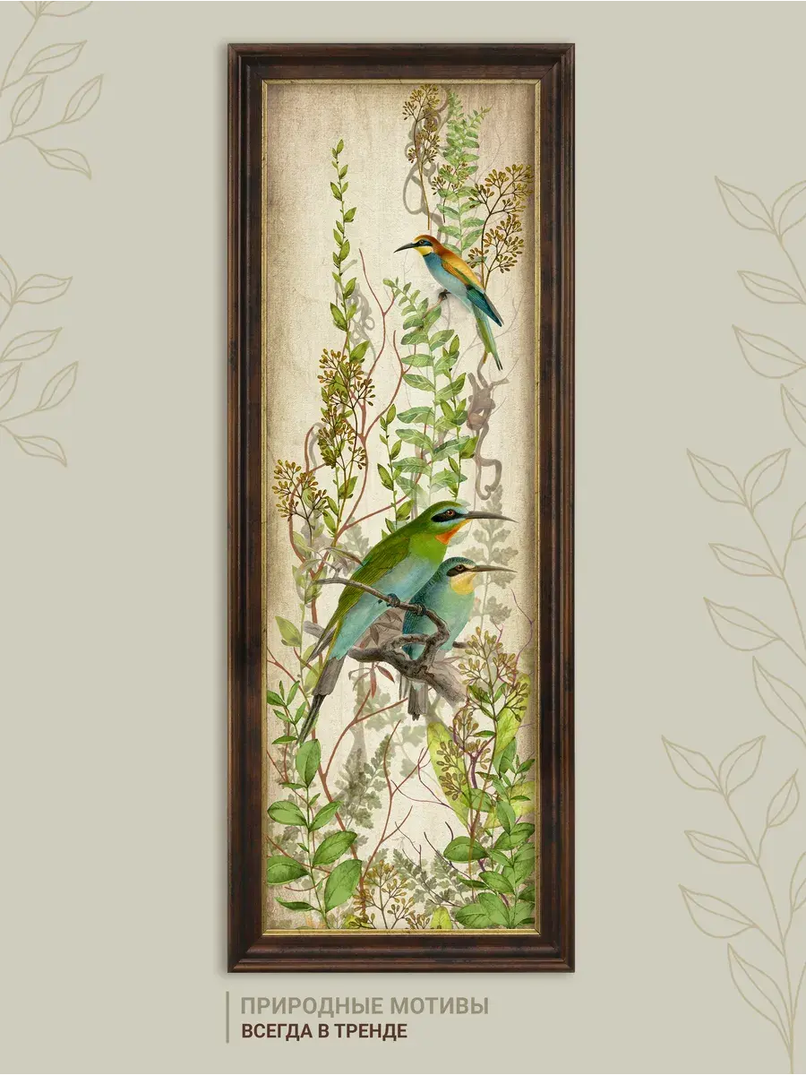Картина "Птички на ветках" напечатана на бумаге, покрыта ламинацией для защиты изображения. Картина готовая в раме размером 19*51 см. Декор для дома с птицами замечательный символичный подарок друзьям и знакомым. Разнообразие сюжетов позволяет собрать домашнюю коллекцию и дополнить интерьер яркими акцентами.