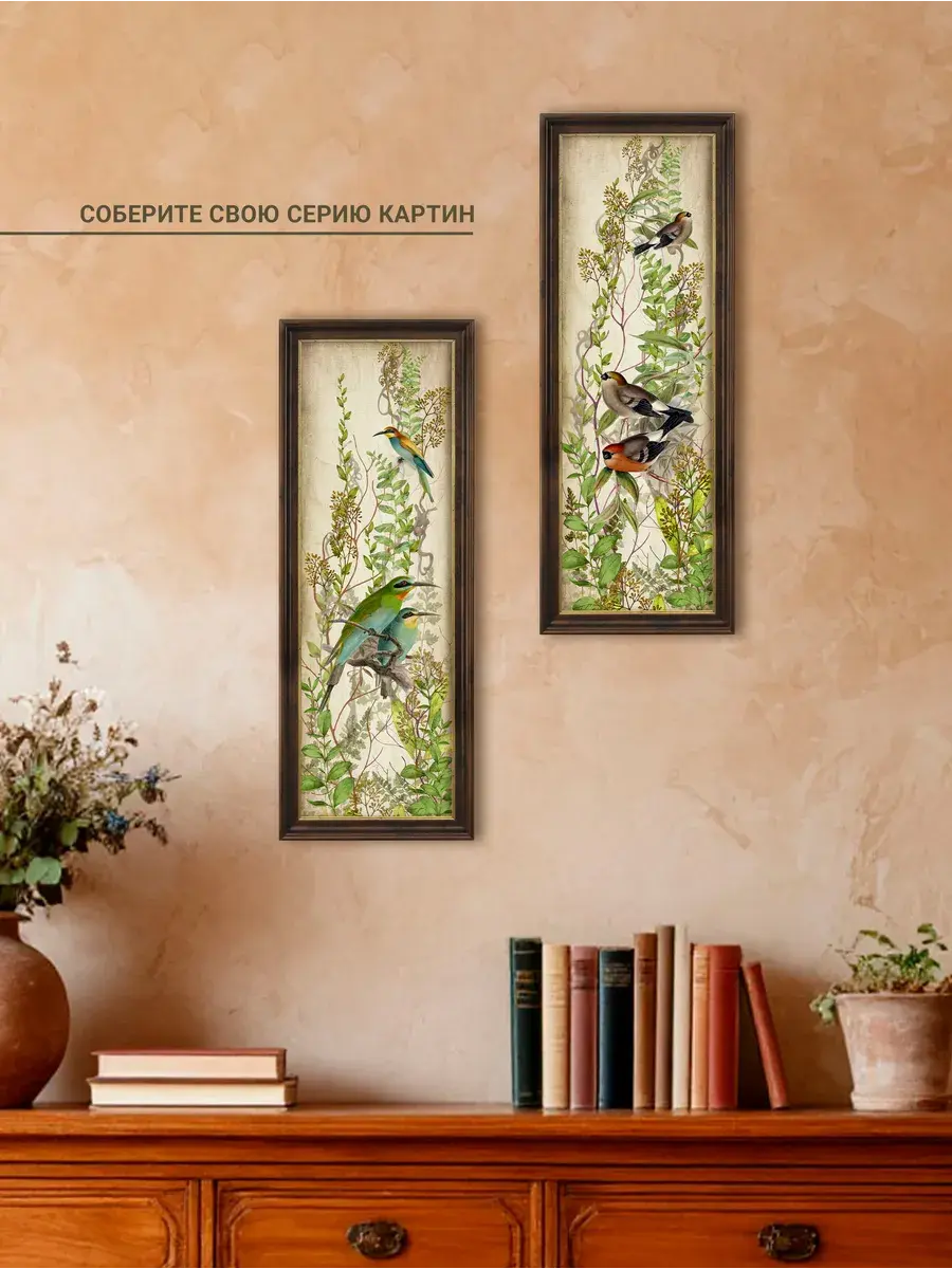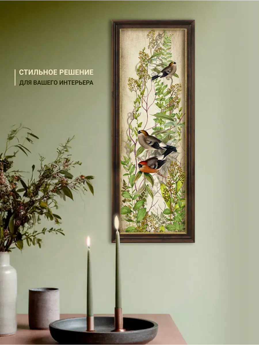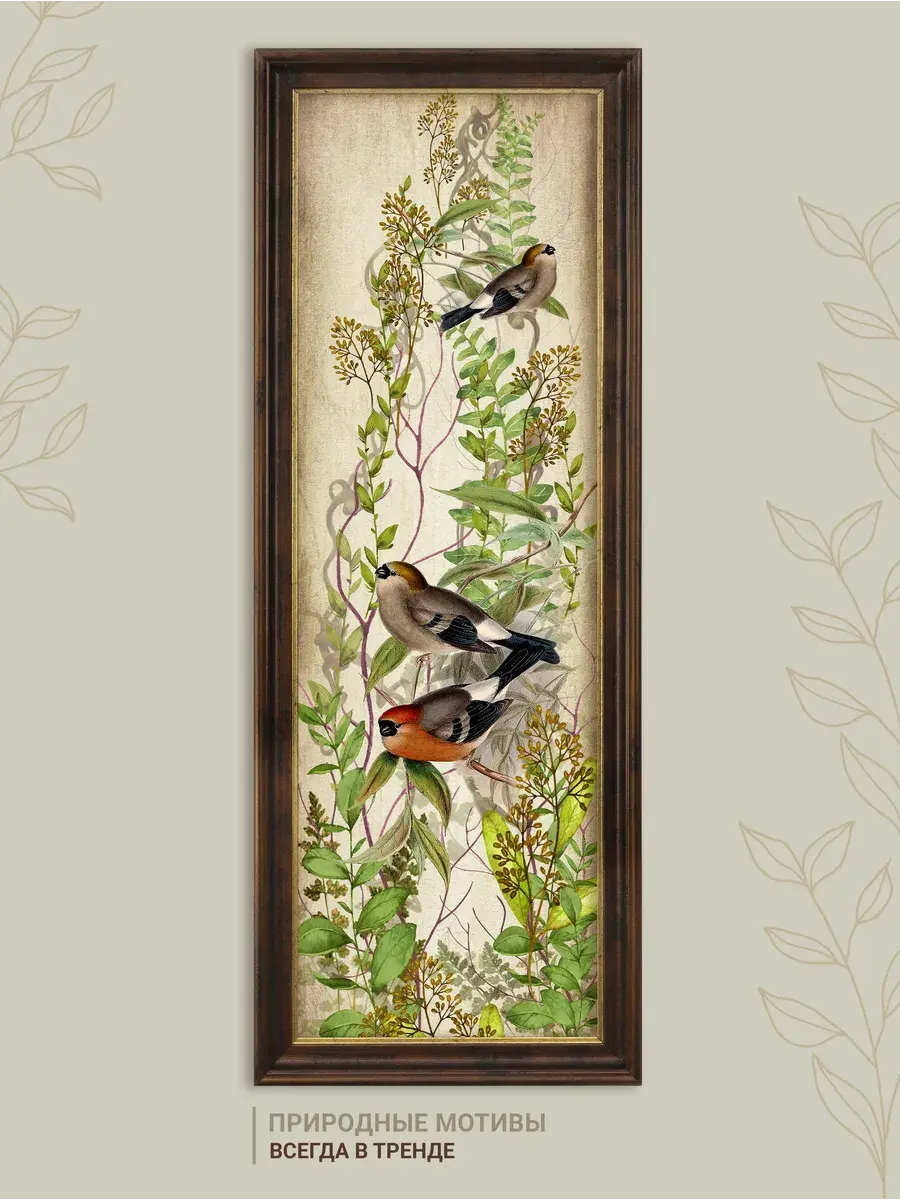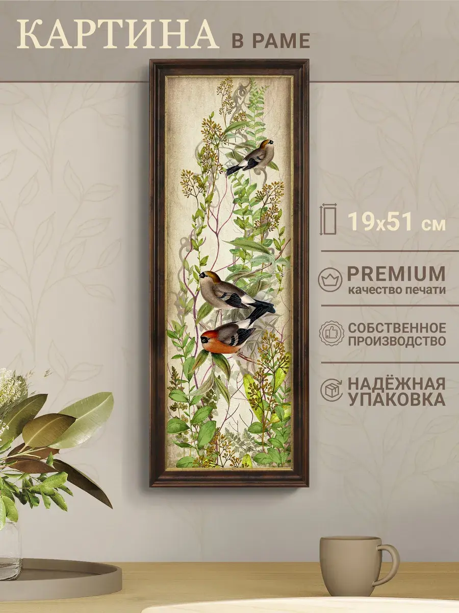 Картина "Птички на ветках" напечатана на бумаге, покрыта ламинацией для защиты изображения. Картина готовая в раме размером 19*51 см. Декор для дома с птицами замечательный символичный подарок друзьям и знакомым. Разнообразие сюжетов позволяет собрать домашнюю коллекцию и дополнить интерьер яркими акцентами.