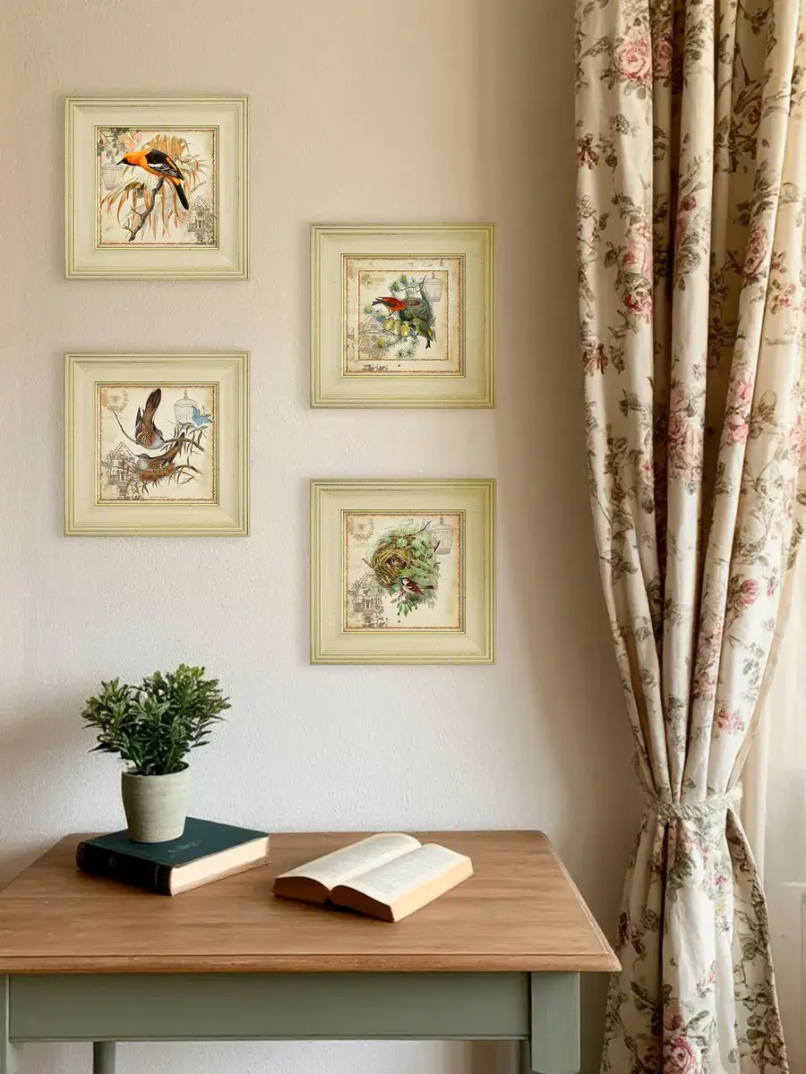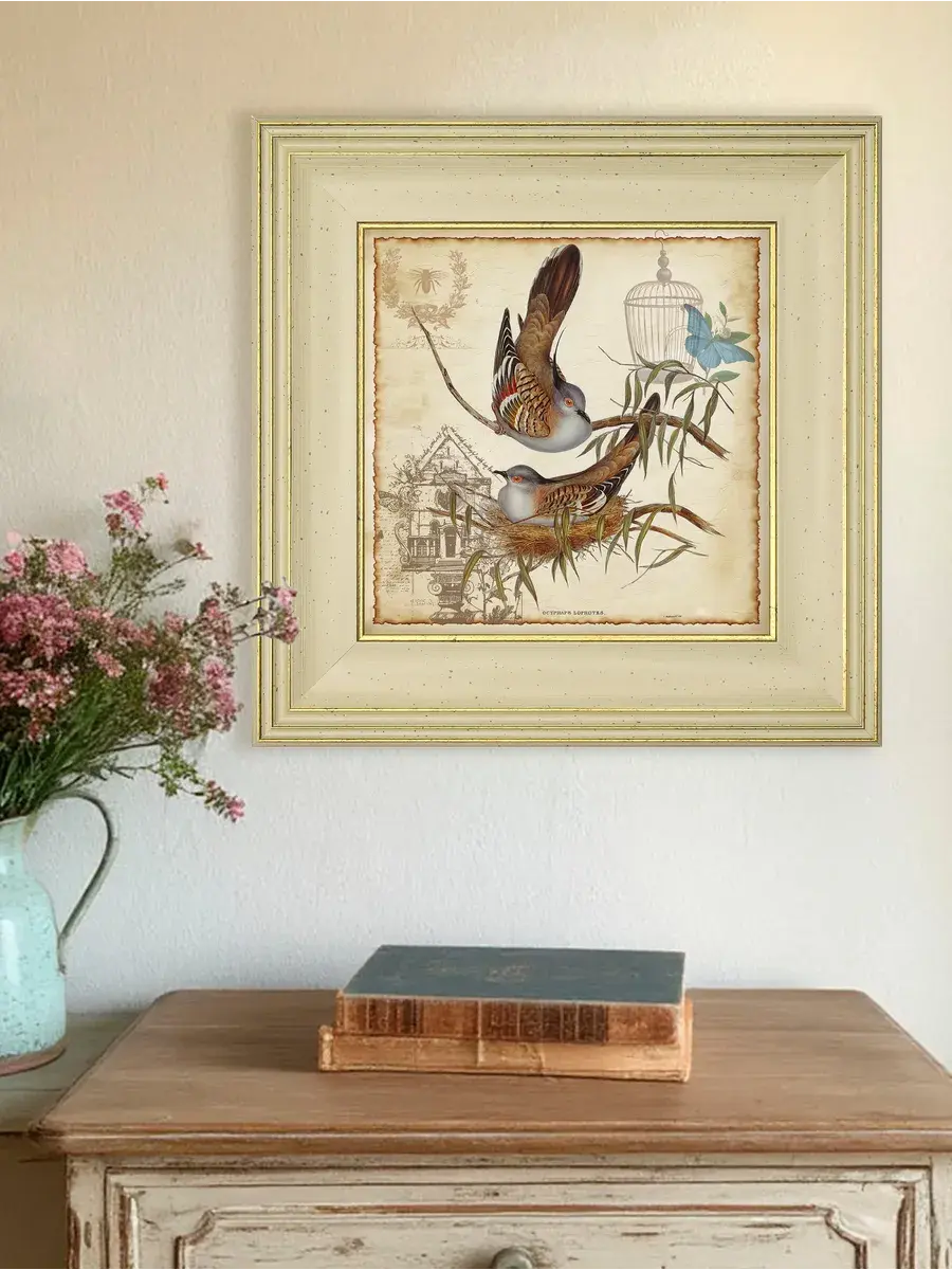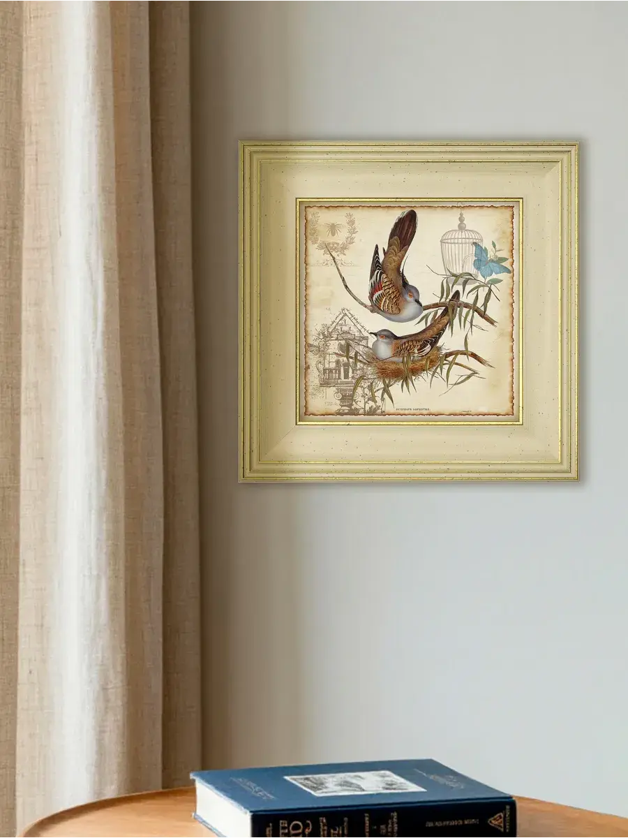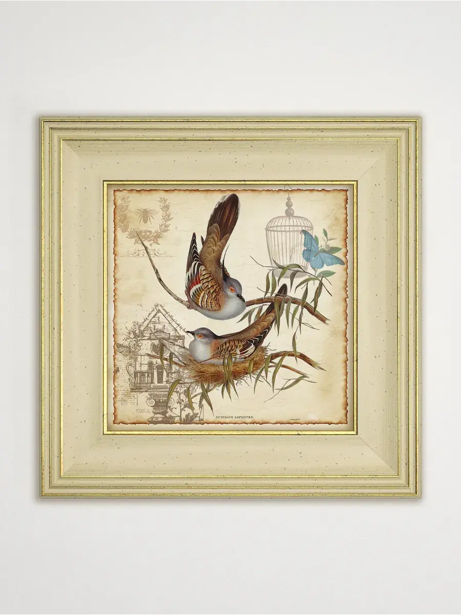 Серия картин "Птички" - это удивительно красивая серия в широком классическом багете, которая добавит уют и спокойствие в ваш дом. Эта интерьерная репродукция, выполненная в технике цифровой печати на хлопковом холсте, станет изящным украшением любой комнаты. Картина размером 30x30 см, напечатана на натуральном холсте и оформлена в раму, что делает ее готовой к размещению на стене. Благодаря удобному креплению, установка картины не займет много времени. Теплые бежевые, оранжевые и золотистые тона рисунка с изображением птиц создадут в вашем доме атмосферу уюта и комфорта, а сама картина станет прекрасным дополнением к вашей домашней коллекции. Картина "Птички" станет прекрасным подарком для любимых бабушек, мам и сестер на день рождения, день матери или новоселье.