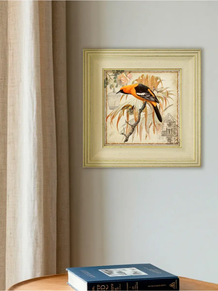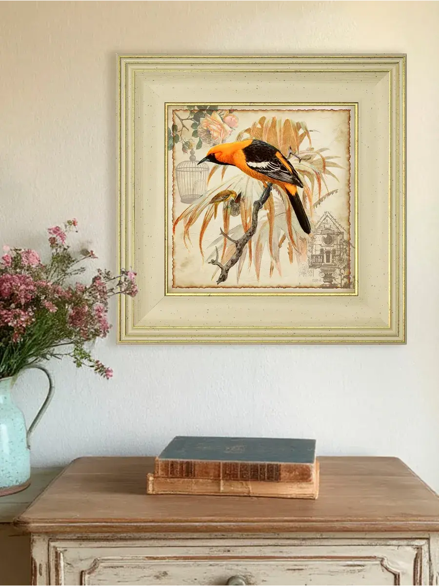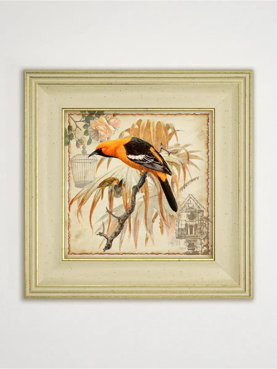 Серия картин "Птички" - это удивительно красивая серия в широком классическом багете, которая добавит уют и спокойствие в ваш дом. Эта интерьерная репродукция, выполненная в технике цифровой печати на хлопковом холсте, станет изящным украшением любой комнаты. Картина размером 30x30 см, напечатана на натуральном холсте и оформлена в раму, что делает ее готовой к размещению на стене. Благодаря удобному креплению, установка картины не займет много времени. Теплые бежевые, оранжевые и золотистые тона рисунка с изображением птиц создадут в вашем доме атмосферу уюта и комфорта, а сама картина станет прекрасным дополнением к вашей домашней коллекции. Картина "Птички" станет прекрасным подарком для любимых бабушек, мам и сестер на день рождения, день матери или новоселье.