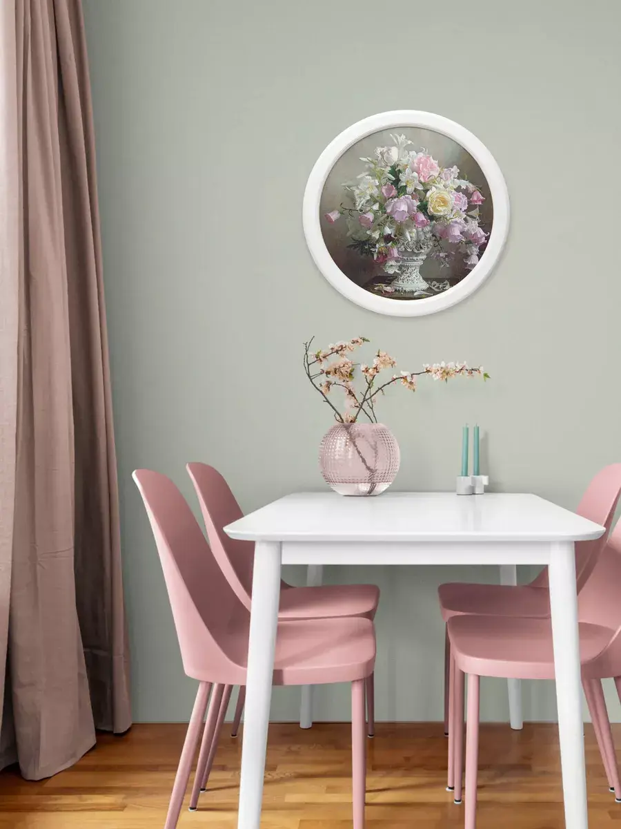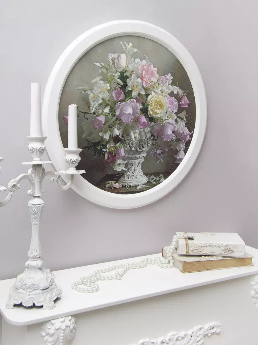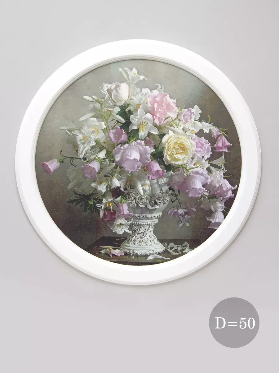 Настенный декор в нежных пастельный тонах с изящными цветами в белоснежной раме. Картина напечатана на натуральном холсте, покрыта матовым лаком в круглой белой раме, станет прекрасным украшением интерьера. Множество вариантов дает возможность создать собственную коллекцию. Рама изготовлена из цельного листа МДФ 16 мм, не имеет зазоров и стыков. Окрашена экологичной акриловой эмалью в белый цвет. Крепление для стены в комплекте.