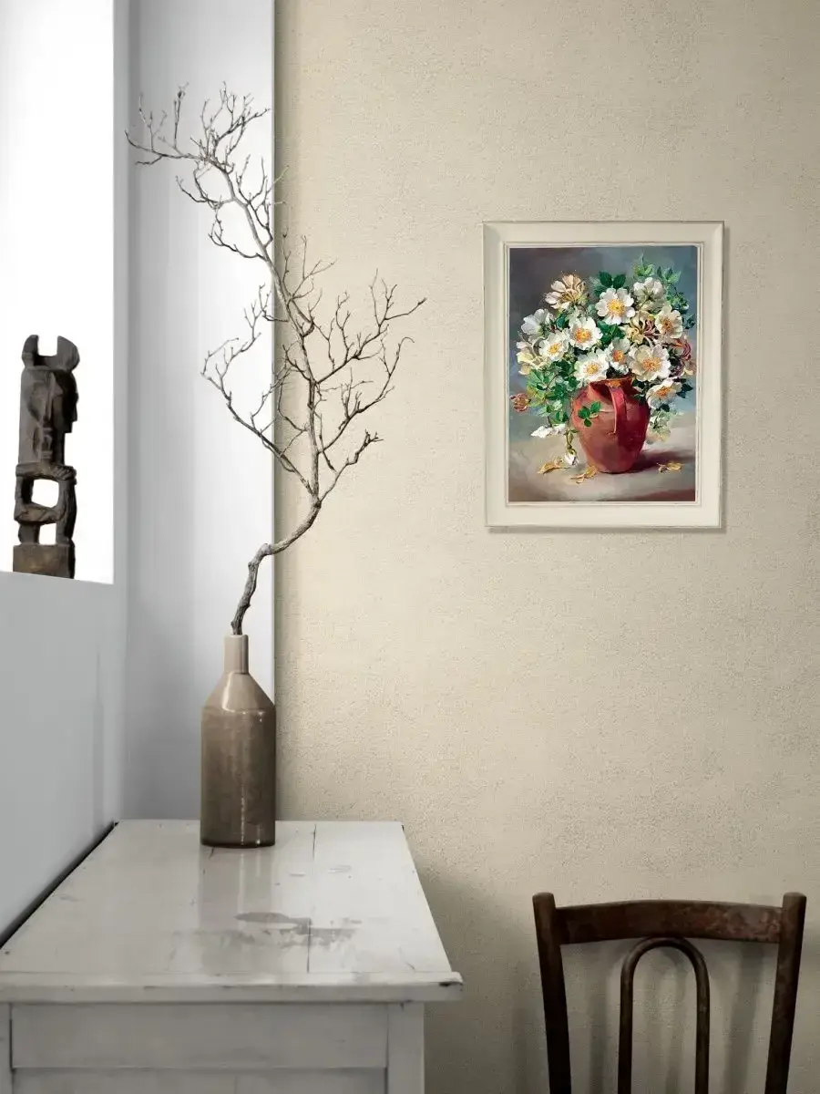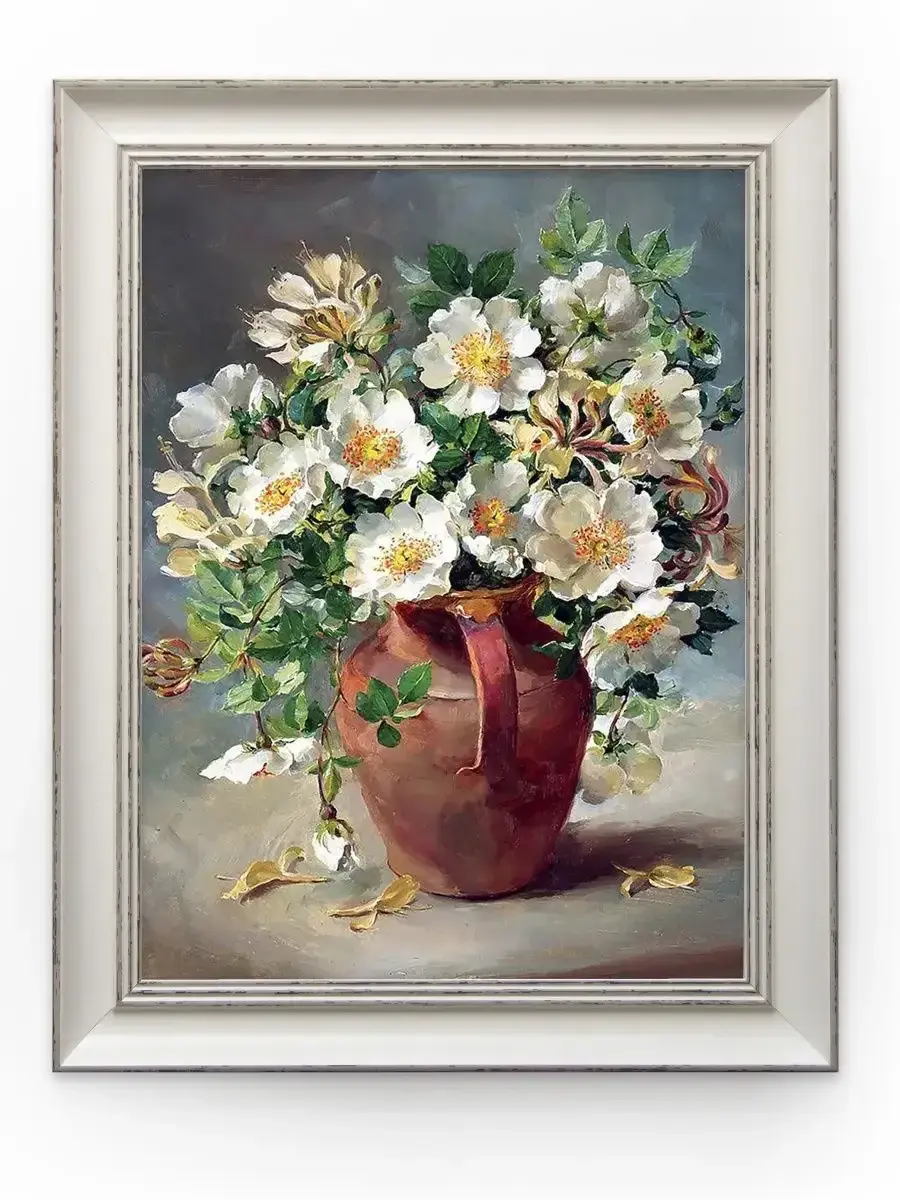 Картина с цветочной композицией станет прекрасным украшением интерьера квартиры, дачи или загородного дома. Интерьерная картина имитирует масляную живопись, идеально впишется в дизайн спальни, гостиной, кухни, прихожей и других помещений. Репродукция выполнена высококачественной печатью, устойчивой к выцветанию, на натуральном холсте, покрыта лаком без запаха. Рама для картины изготовлена из полиуретана. Картина в раме - актуальный во все времена элемент декора, который придает интерьеру статусность, уют и привносит особую атмосферу в пространство. Поэтому картина, оформленная в багет - отличный подарок близкому человеку на любое событие. Размер картины по холсту 30 на 40 см, в раме 38 на 48. Для безопасной доставки мы используем защитные упаковочные материалы. Живопись идеально будет смотреться в комплекте с другими картинами коллекции.
