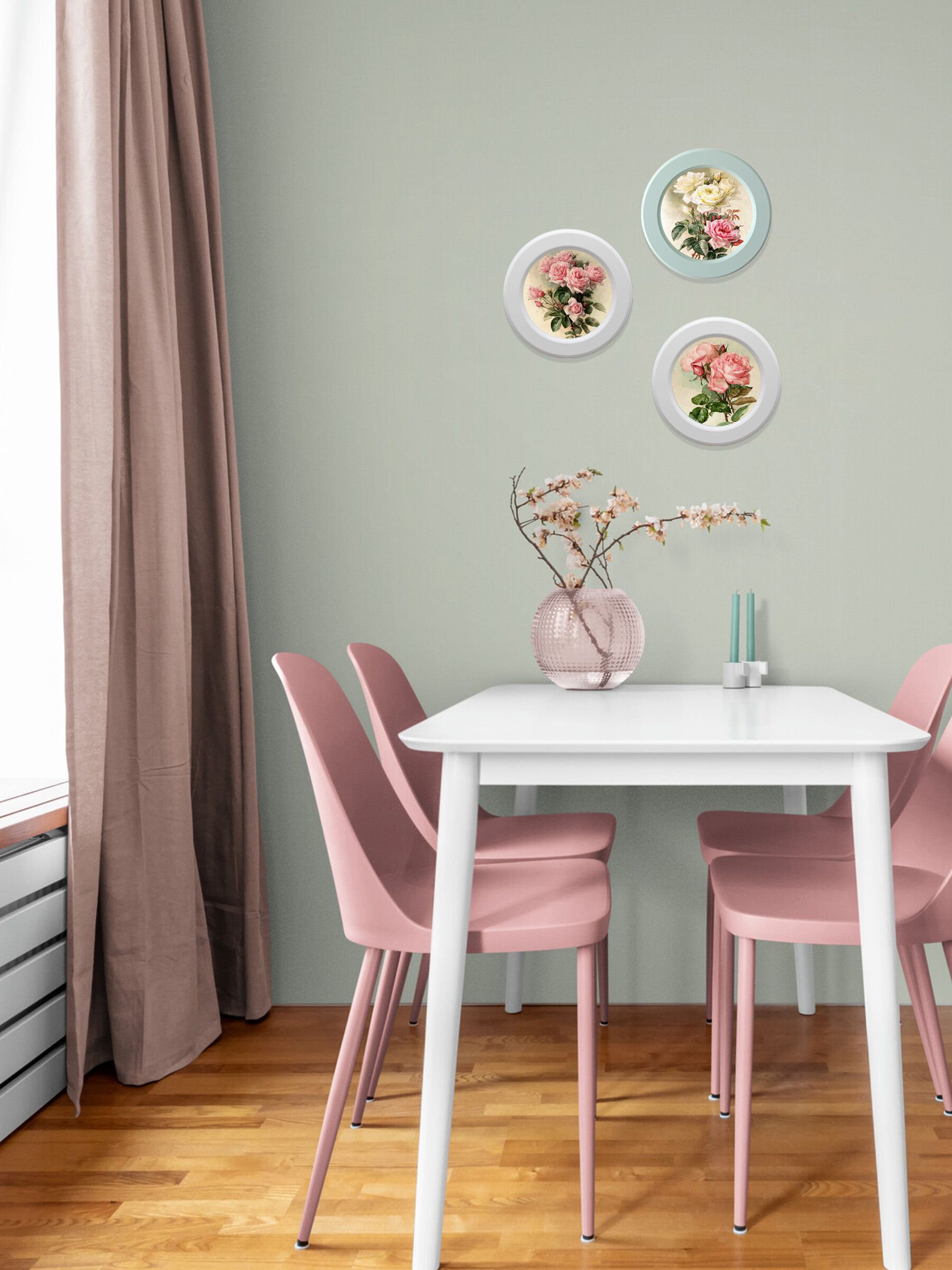 Настенный декор в нежных пастельный тонах с изящными цветами в белоснежной раме. Картина напечатана на натуральном холсте, покрыта матовым лаком в круглой белой раме станет прекрасным украшением интерьера. Множество вариантов дает возможность создать собственную коллекцию. Рама изготовлена из цельного листа МДФ 16 мм, не имеет зазоров и стыков. Окрашена экологичной акриловой эмалью в белый цвет. Картины представлены в 3х размерах 17, 27 и 37 см. Крепление для стены в комплекте.