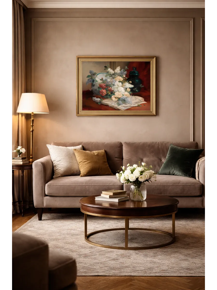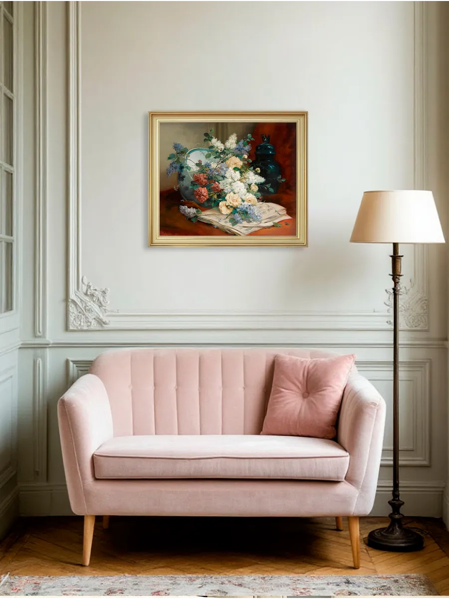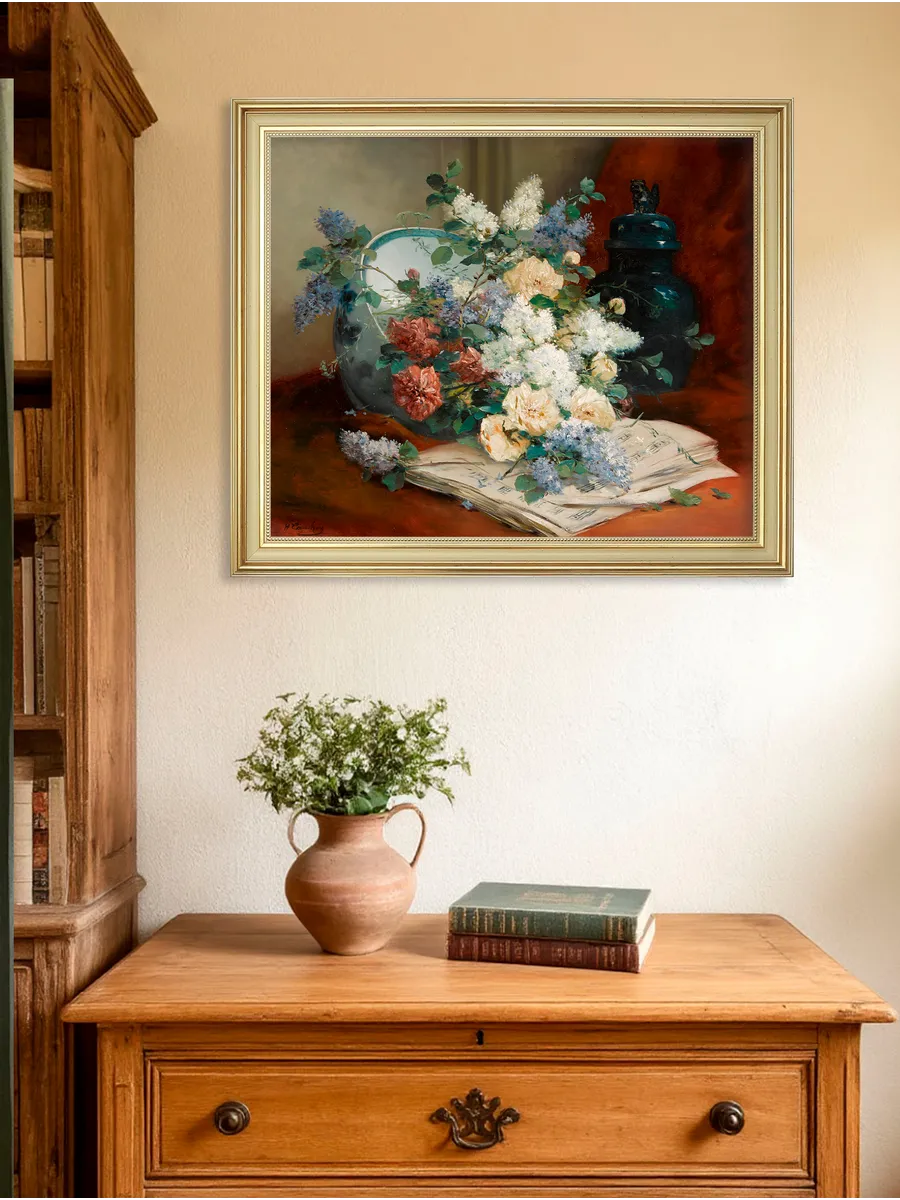 Интерьерная картина с цветочной композицией добавит дому уют, глубину и атмосферу классического декора. Подходит для гостиной, спальни, кухни, прихожей и кабинета.