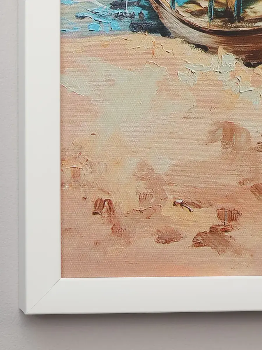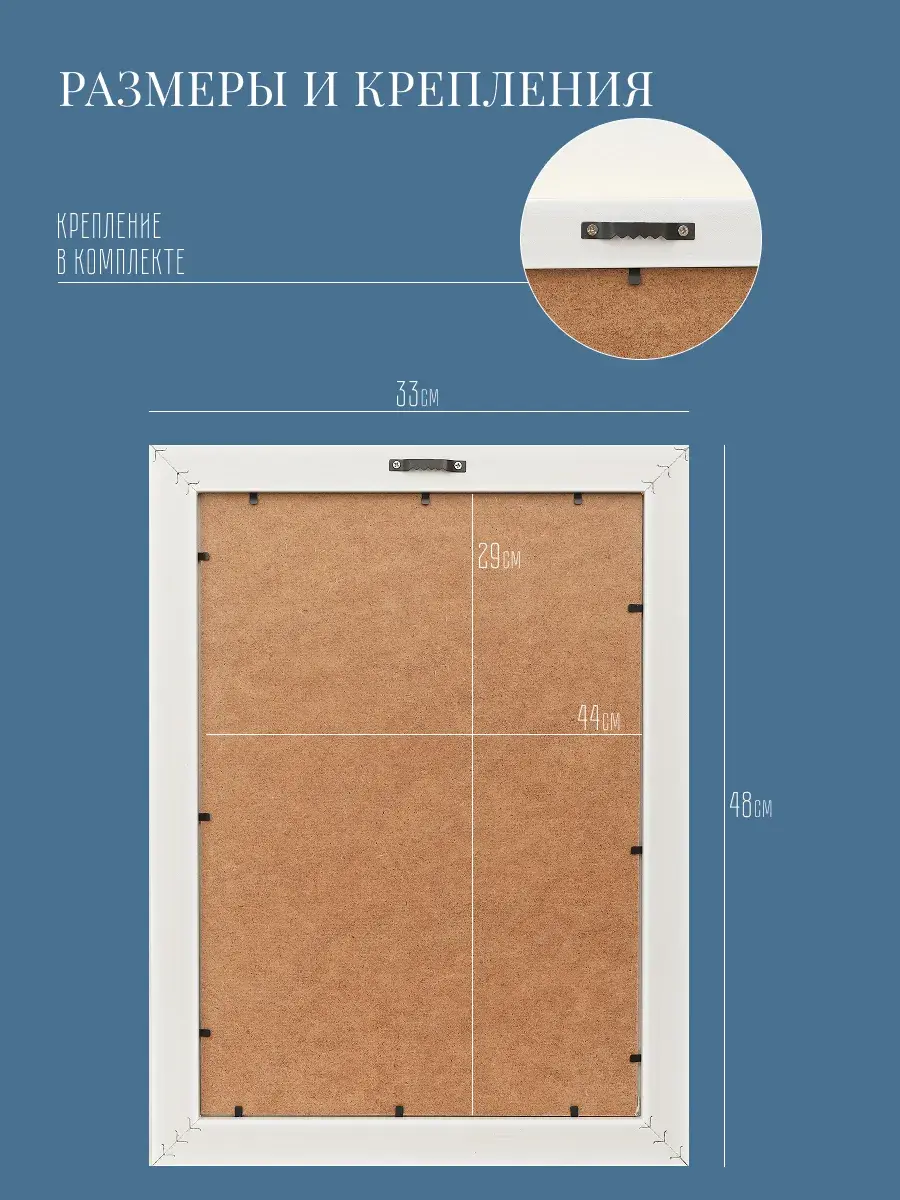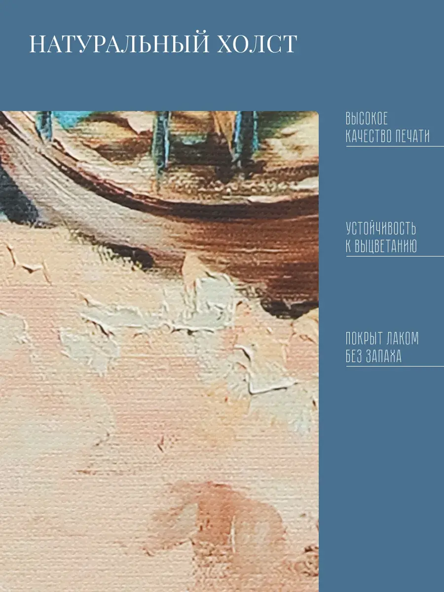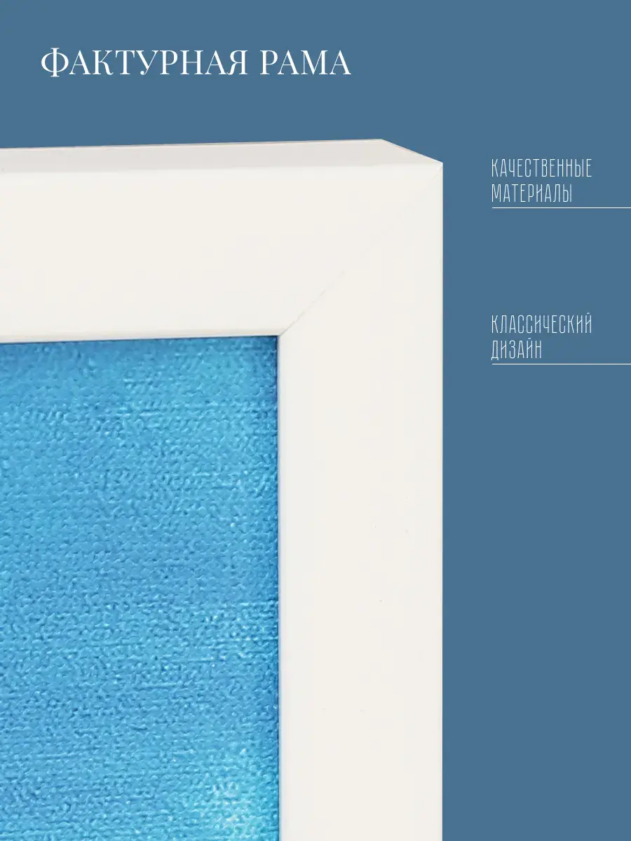 Картина напечатана на натуральном холсте, покрыта матовым лаком. Основа из ХДФ, что исключает провисание холста. Багетная рама из полиуретана матовая белая, с круглым профилем. Крепление для стены в комплекте.