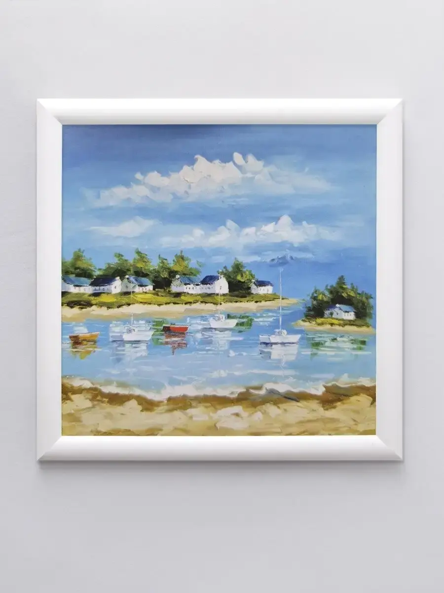 Картина напечатана на натуральном холсте, покрыта матовым лаком. Основа из ХДФ, что исключает провисание холста. Багетная рама из полиуретана матовая белая, с круглым профилем. Крепление для стены в комплекте.