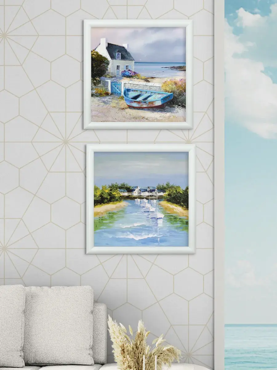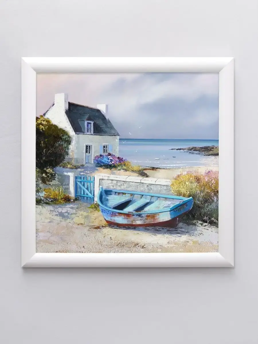 Картина напечатана на натуральном холсте, покрыта матовым лаком. Основа из ХДФ, что исключает провисание холста. Багетная рама из полиуретана матовая белая, с круглым профилем. Крепление для стены в комплекте.