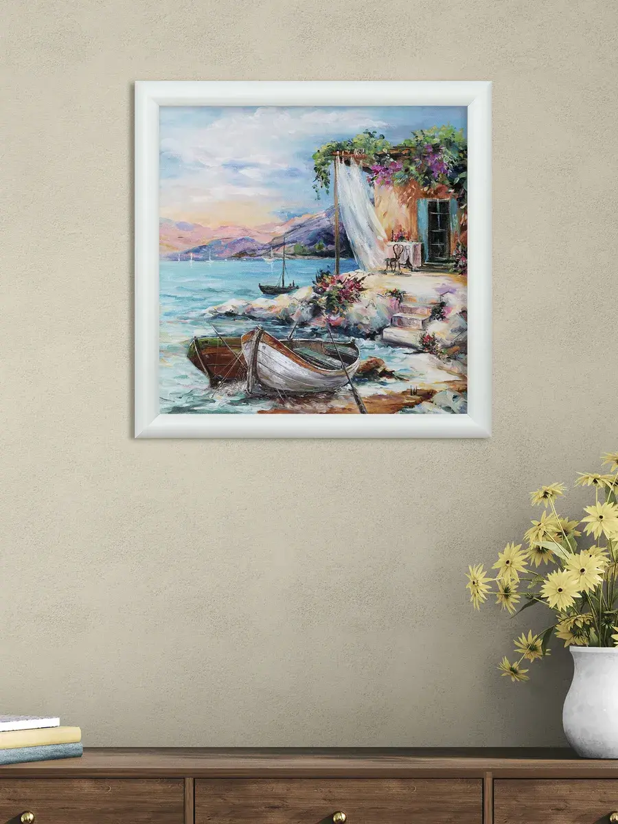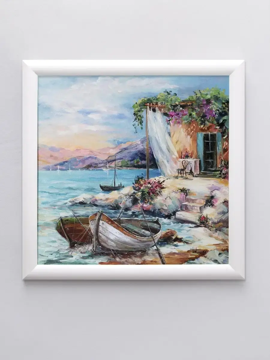 Картина напечатана на натуральном холсте, покрыта матовым лаком. Основа из ХДФ, что исключает провисание холста. Багетная рама из полиуретана матовая белая, с круглым профилем. Крепление для стены в комплекте.