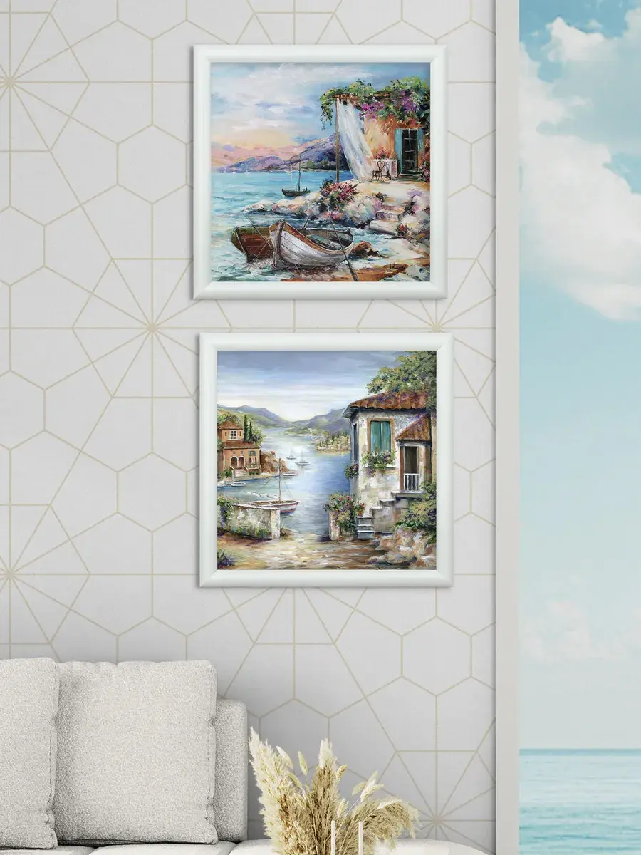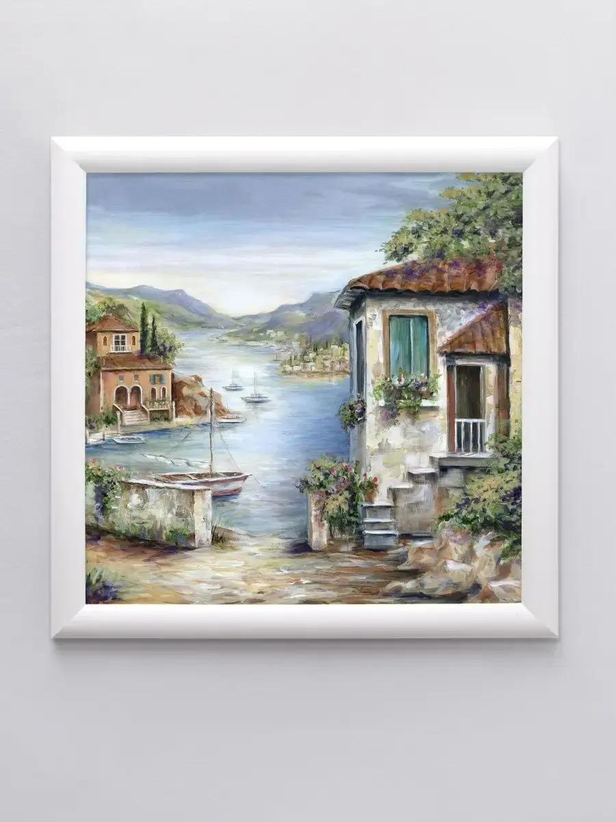 Картина напечатана на натуральном холсте, покрыта матовым лаком. Основа из ХДФ, что исключает провисание холста. Багетная рама из полиуретана матовая белая, с круглым профилем. Крепление для стены в комплекте.