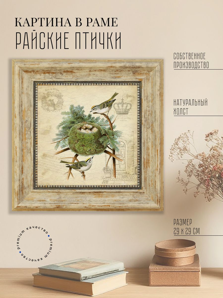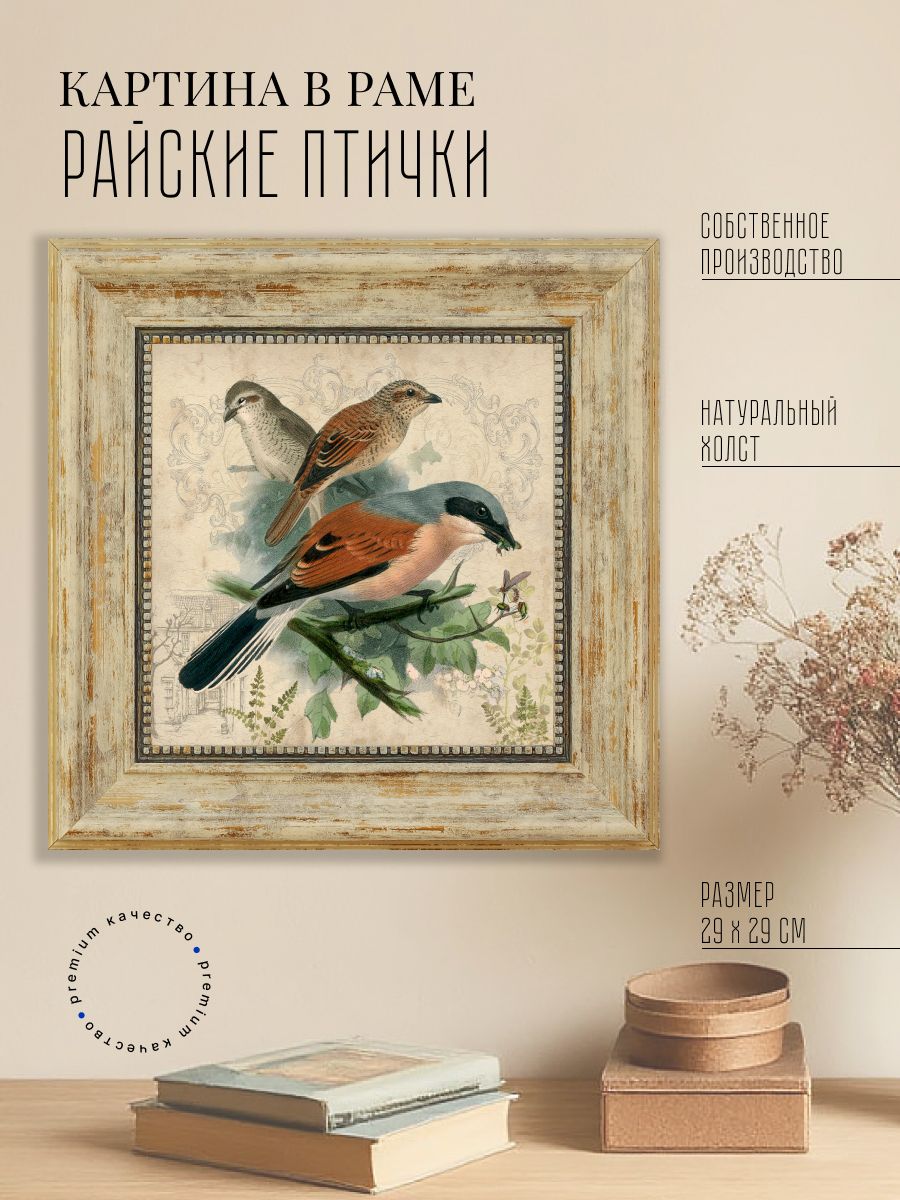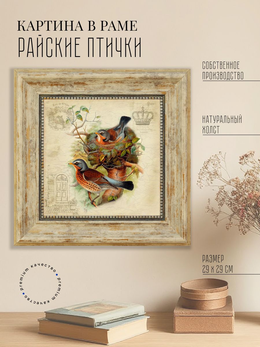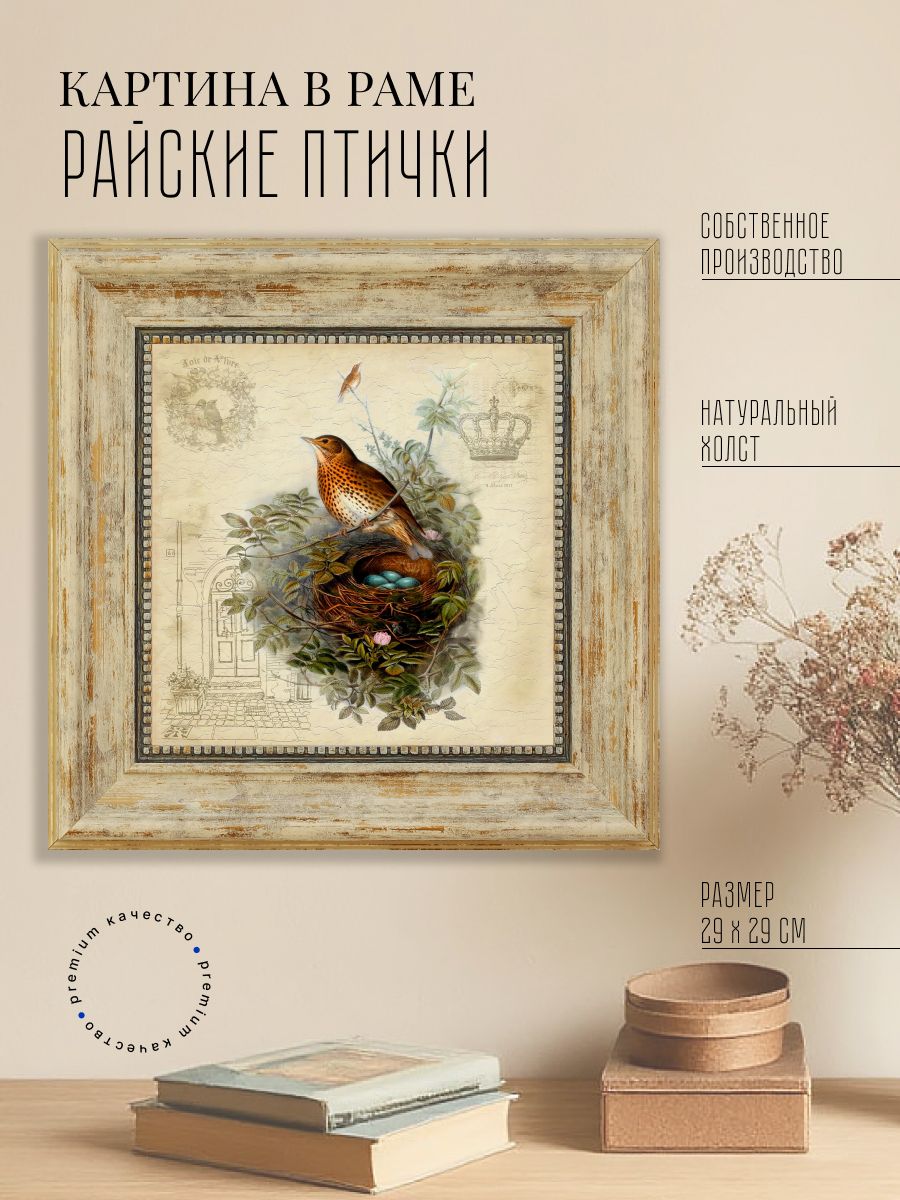 Укрась свой дом уникальными картинами "Птички" на натуральном холсте размером 29*29 см, холст 20*20см. Картины созданы дизайнерами Elensdecor с использованием иллюстраций художников 19 века. Настенный декор для коллекции в широкой винтажной раме создаст уют и дополнит интерьер вашего дома, гостиной, спальни, кухни, детской комнаты, прихожей. Картина напечатана на качественном холсте, защищена лаком для долговечности. Картина "Птички" станет отличным подарком для ценителей декора и символизирует красоту природы. Добавьте эту картину в свою коллекцию и создайте уникальный уголок в вашем доме, наполненный уютом и теплом. Порадуйте себя или своих близких этим прекрасным художественным произведением! Крепление для стены в комплекте.