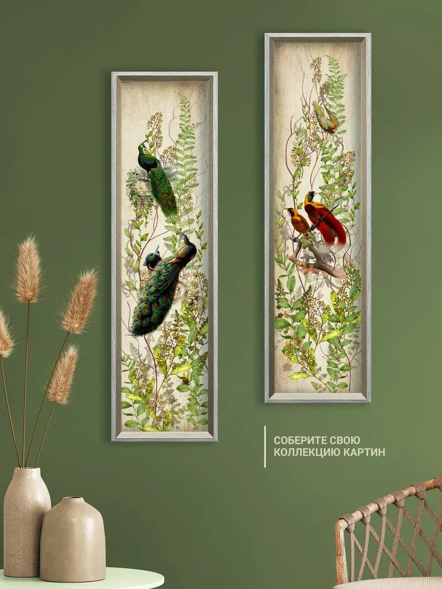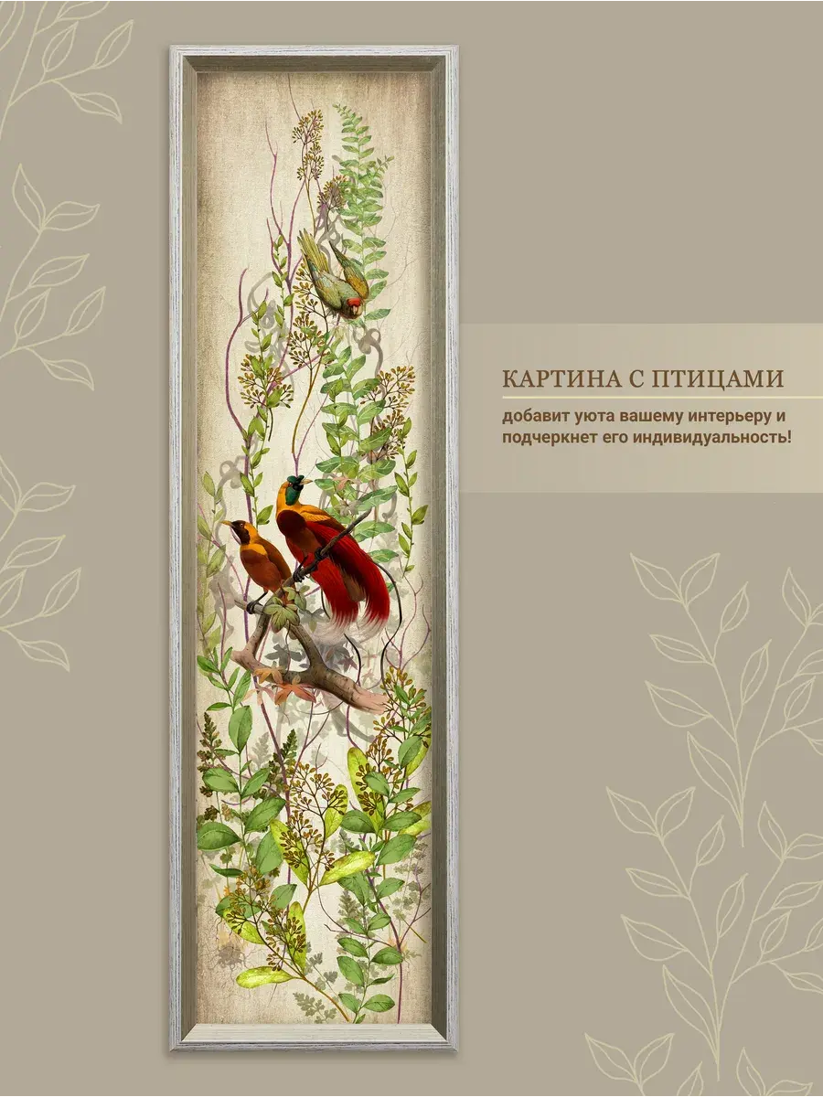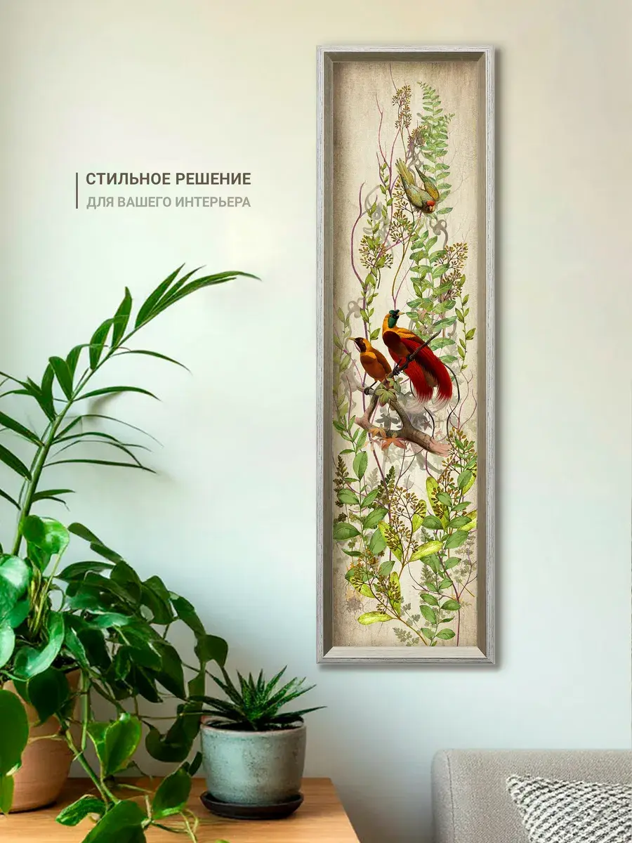 Картина "Птички на ветках" напечатана на бумаге, покрыта ламинацией для защиты изображения. Картина готовая в раме размером 21х73 см. Декор для дома с птицами замечательный символичный подарок друзьям и знакомым. Разнообразие сюжетов позволяет собрать домашнюю коллекцию и дополнить интерьер яркими акцентами.