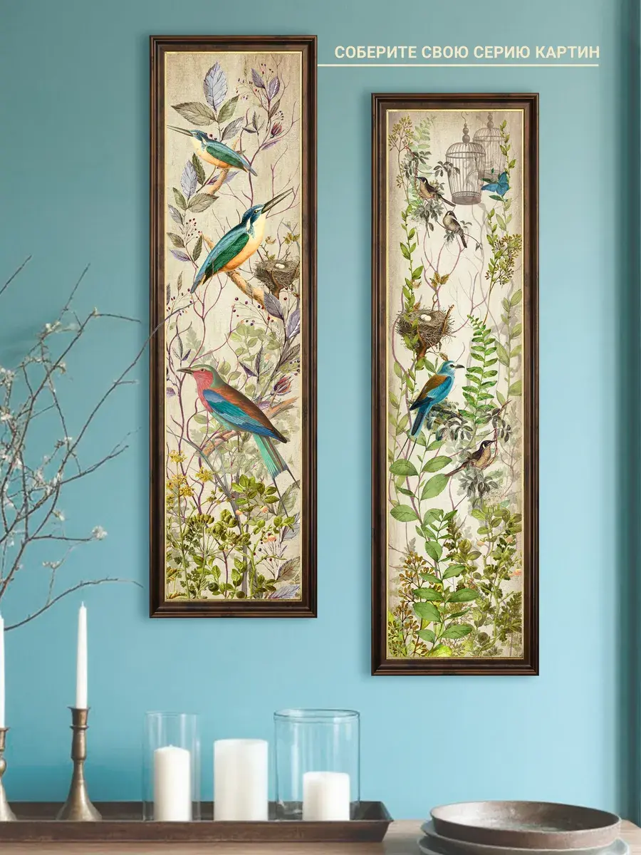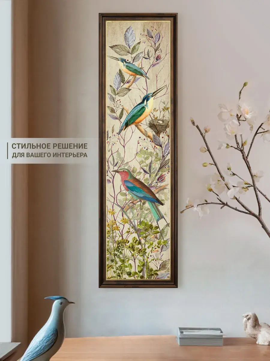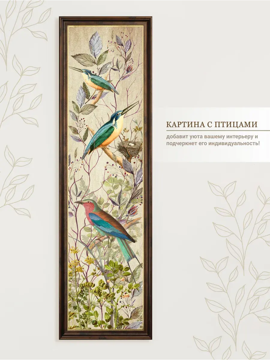 Картина "Птички на ветках" напечатана на бумаге, покрыта ламинацией для защиты изображения. Картина готовая в раме размером 21х73 см. Декор для дома с птицами замечательный символичный подарок друзьям и знакомым. Разнообразие сюжетов позволяет собрать домашнюю коллекцию и дополнить интерьер яркими акцентами.