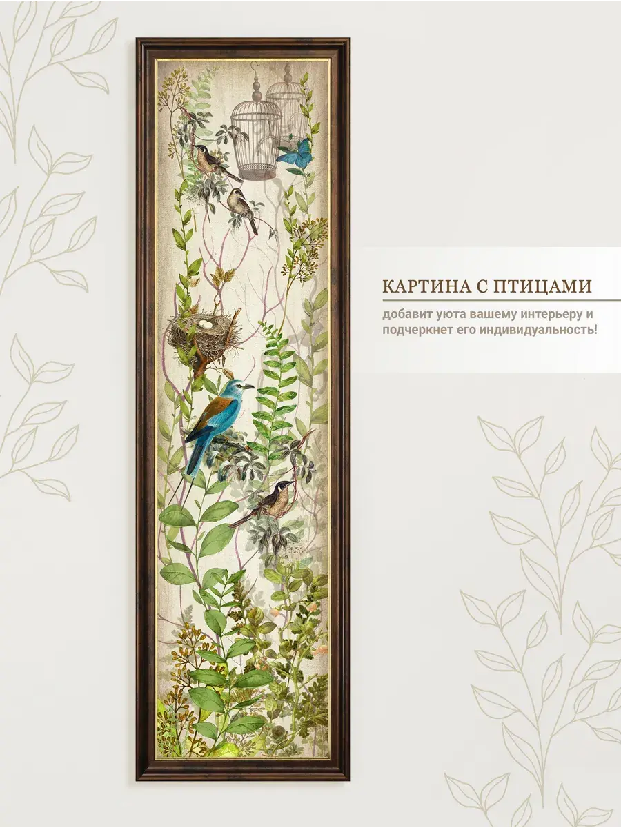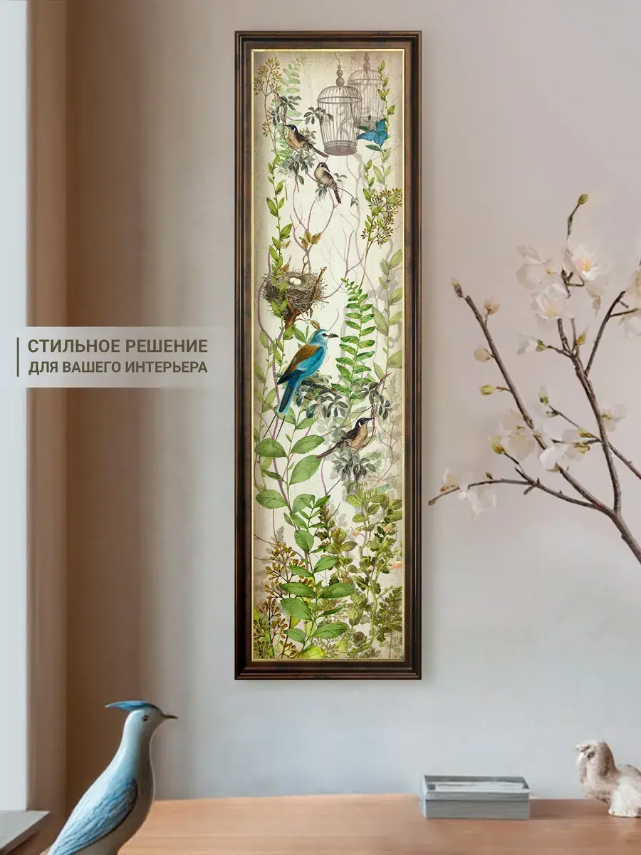 Картина "Птички на ветках" напечатана на бумаге, покрыта ламинацией для защиты изображения. Картина готовая в раме размером 21х73 см. Декор для дома с птицами замечательный символичный подарок друзьям и знакомым. Разнообразие сюжетов позволяет собрать домашнюю коллекцию и дополнить интерьер яркими акцентами.