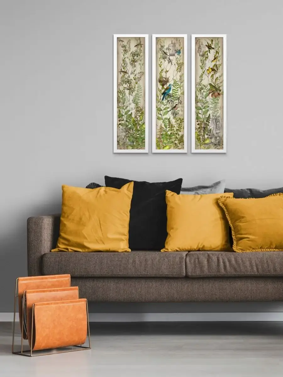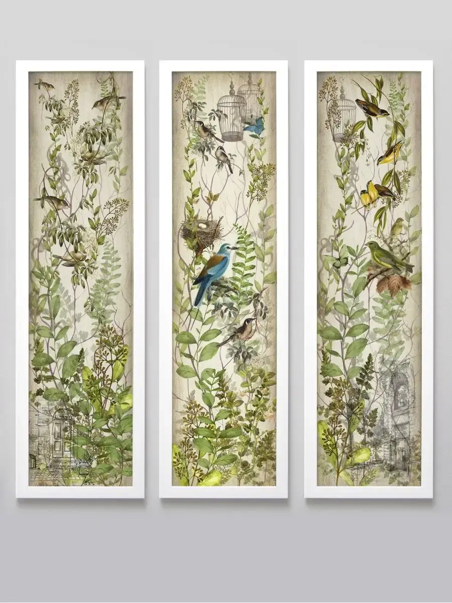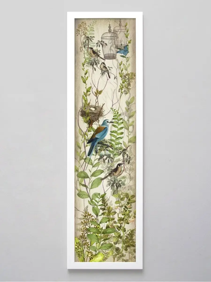 Картина "Птички на ветках" напечатана на бумаге, покрыта ламинацией для защиты изображения. Картина готовая в раме размером 21х73 см. Разнообразие сюжетов позволяет собрать домашнюю коллекцию и дополнить интерьер яркими акцентами.