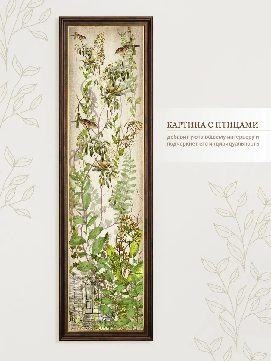 Картина "Птички на ветках" напечатана на бумаге, покрыта ламинацией для защиты изображения. Картина готовая в раме размером 21х73 см. Декор для дома с птицами замечательный символичный подарок друзьям и знакомым. Разнообразие сюжетов позволяет собрать домашнюю коллекцию и дополнить интерьер яркими акцентами.
