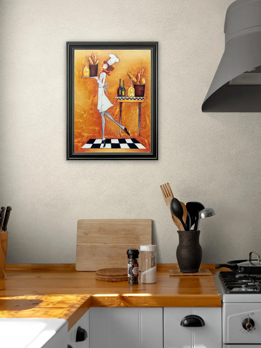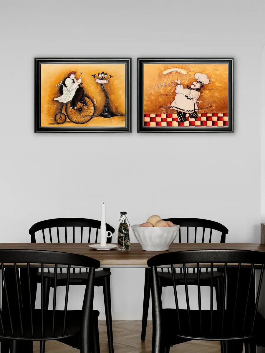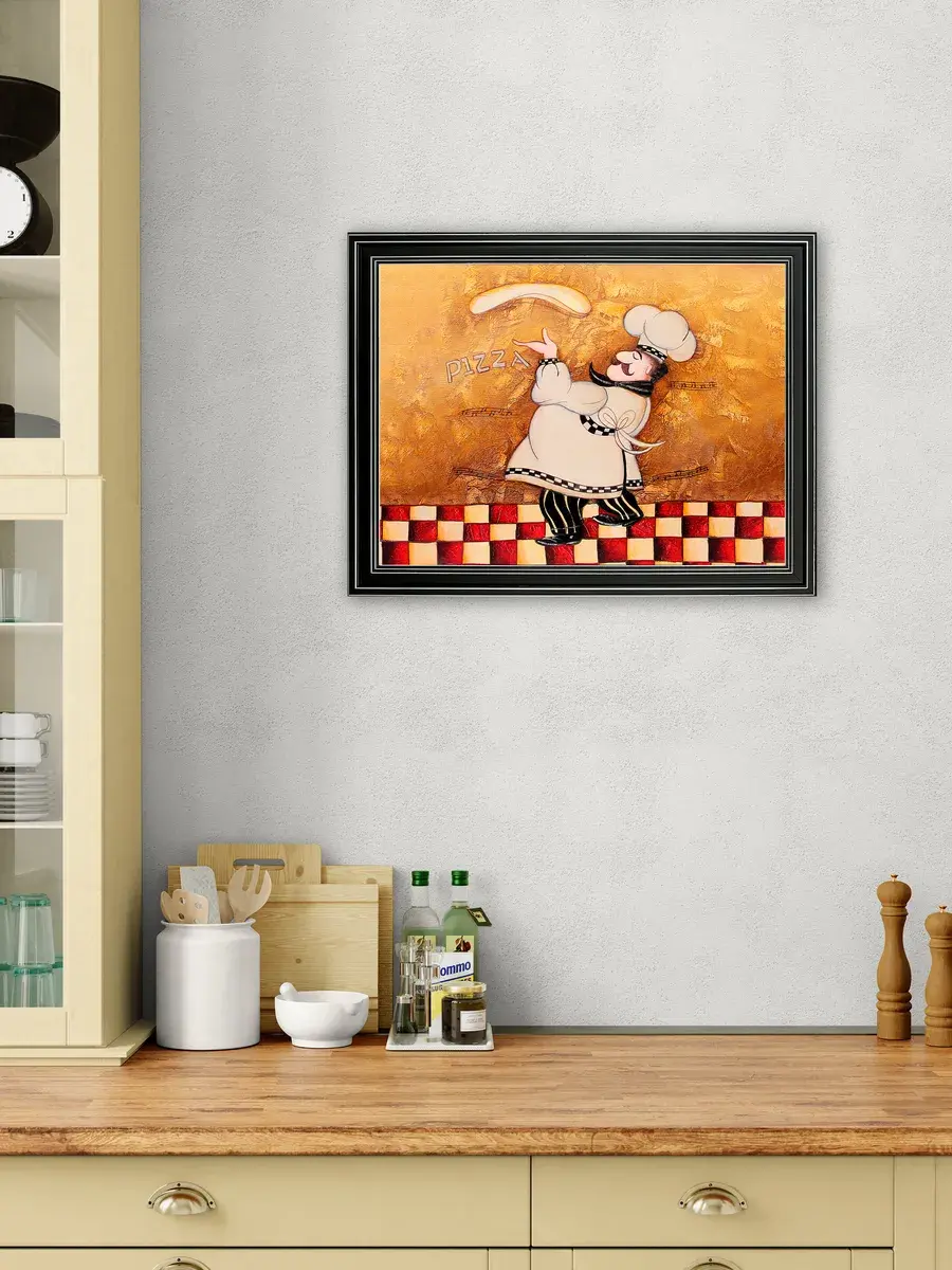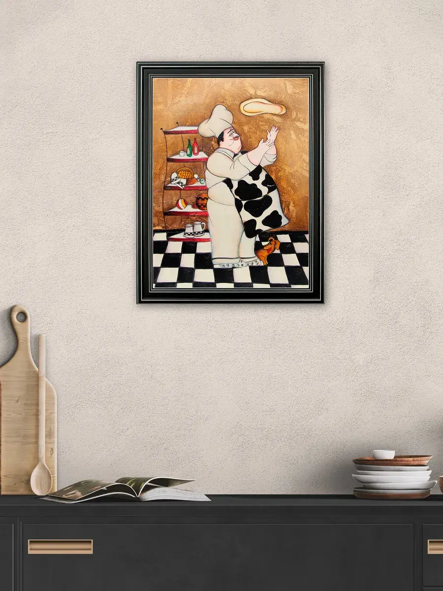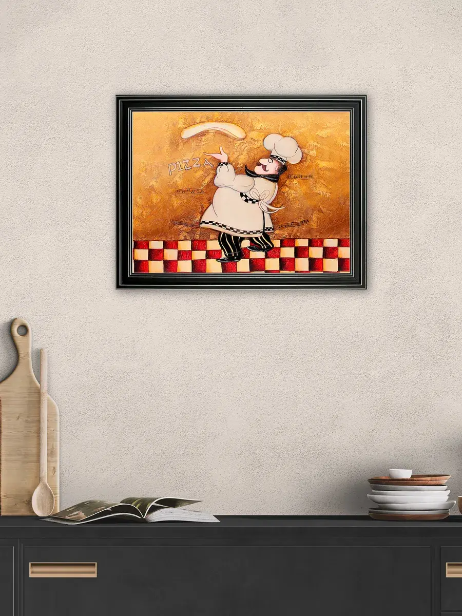 Настенный декор - картина с винтажными поварами в лаконичной черной раме с серебряным орнаментом. Картина напечатана на натуральном холсте, покрыта матовым лаком станет прекрасным дополнением и украшением интерьера. Картина украсит и дополнит интерьер кухни, столовой, кафе. Милый сувенир или просто подарок без повода. Рама изготовлена из полиуретана. Размер картины 35*45 см размер изображения 29*39 см. Крепление для стены в комплекте.