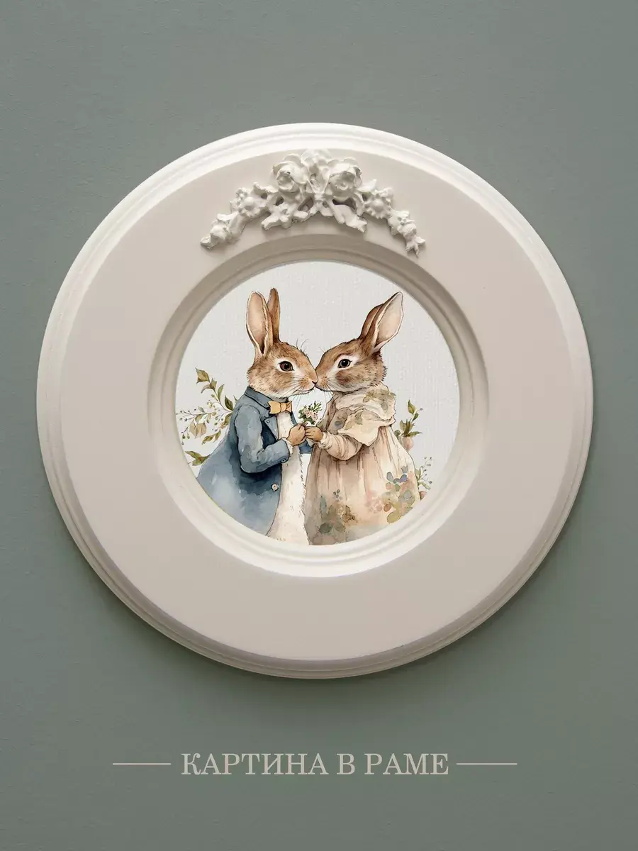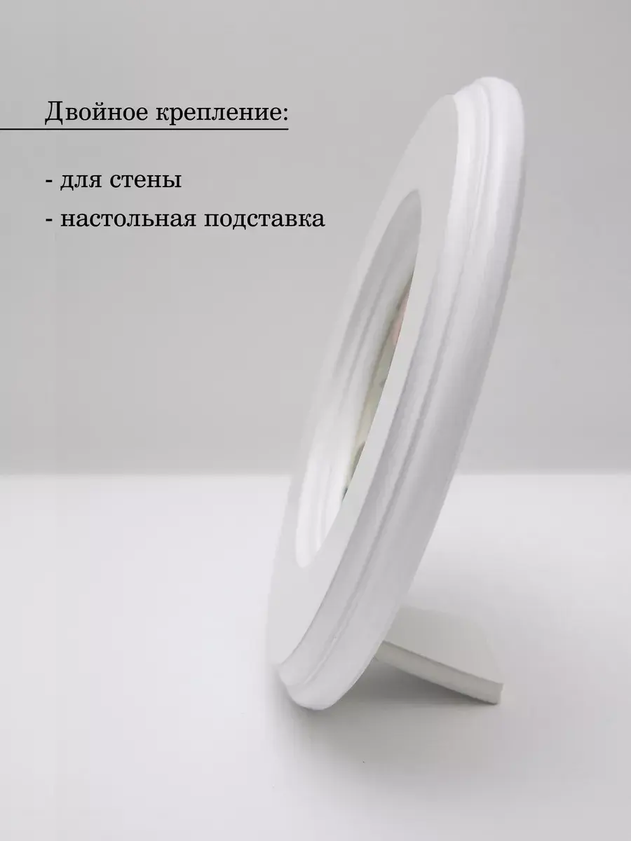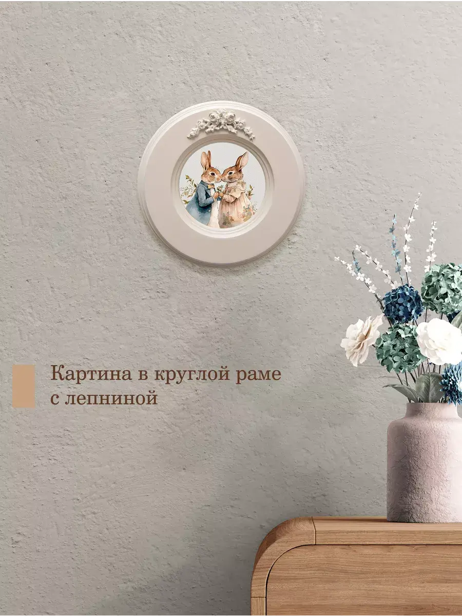 Рама с лепниной изготовлена из цельного листа МДФ 16 мм, не имеет зазоров и стыков. Окрашена экологичной акриловой эмалью в молочный цвет. Диаметр картины 17,5 см, диаметр изображения 9 см.