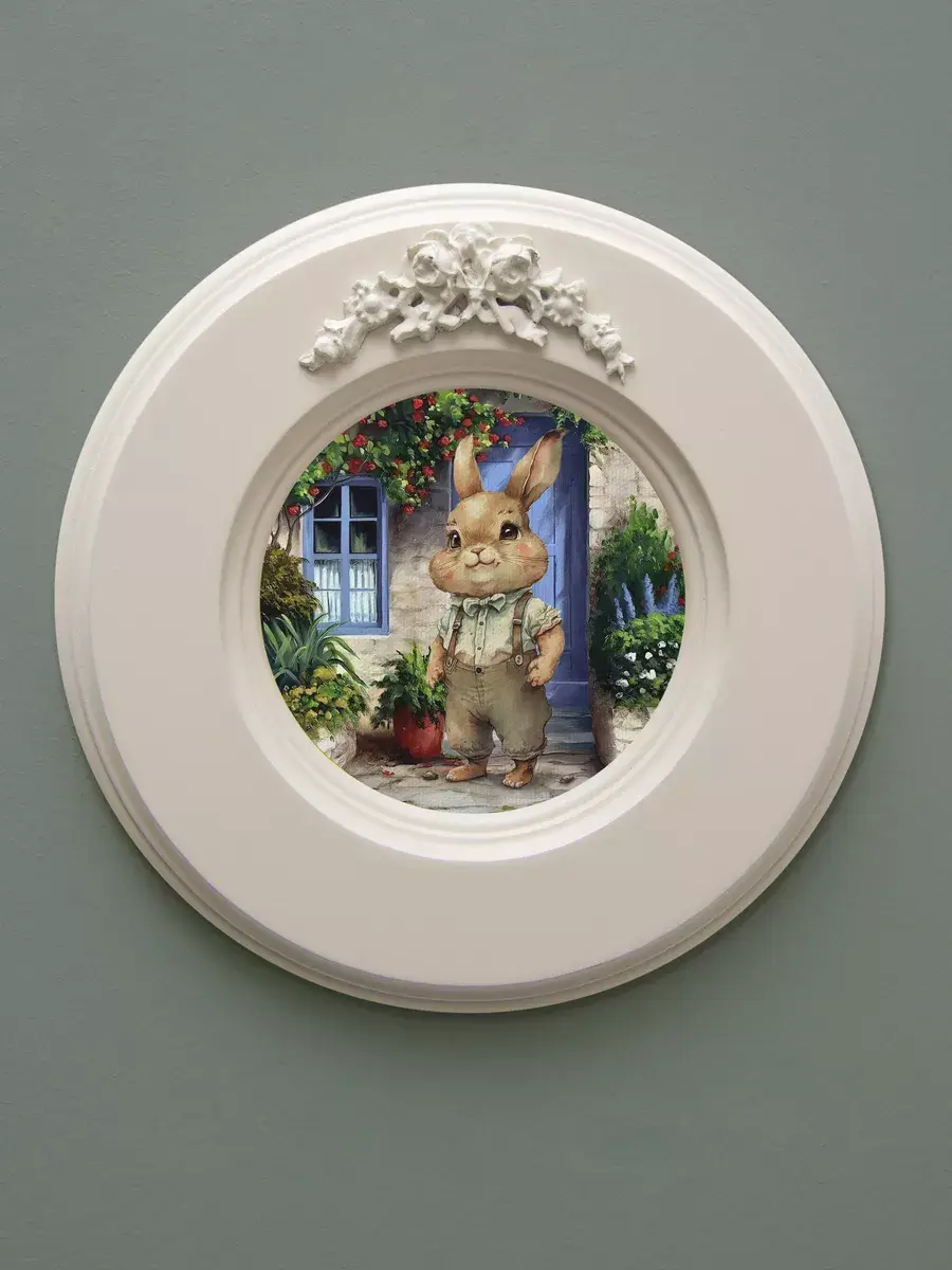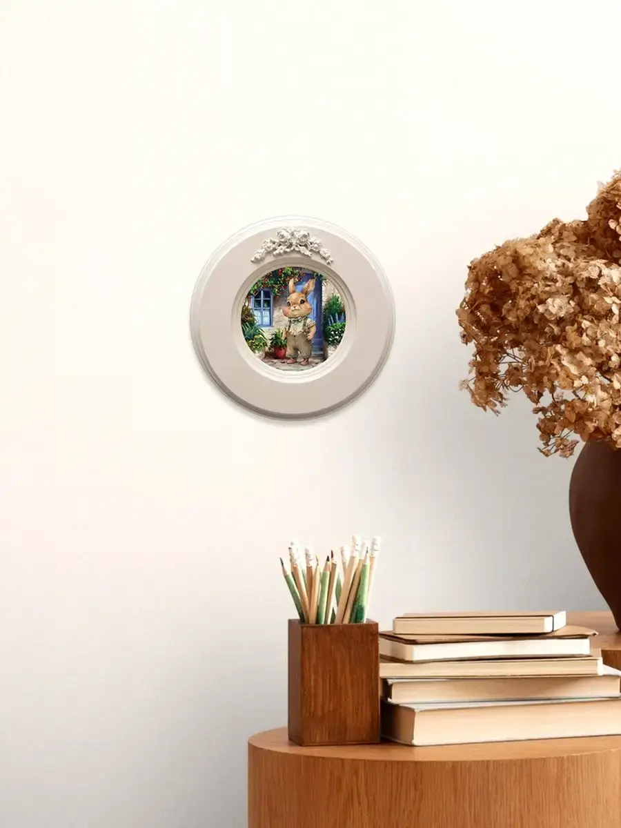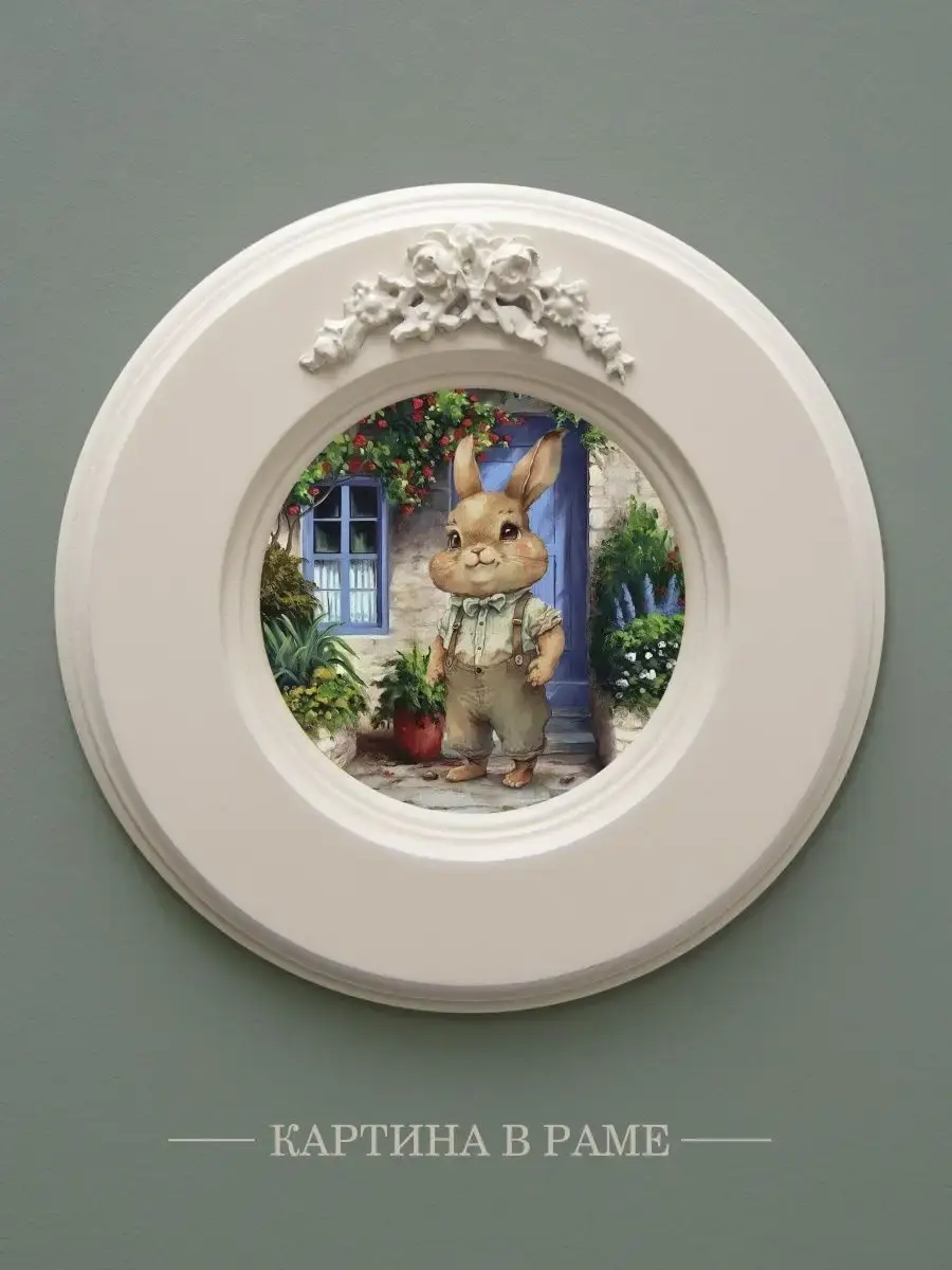 Рама с лепниной изготовлена из цельного листа МДФ 16 мм, не имеет зазоров и стыков. Окрашена экологичной акриловой эмалью в молочный цвет. Диаметр картины 17,5 см, диаметр изображения 9 см.