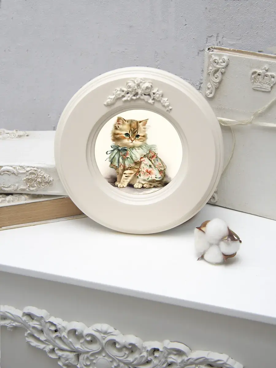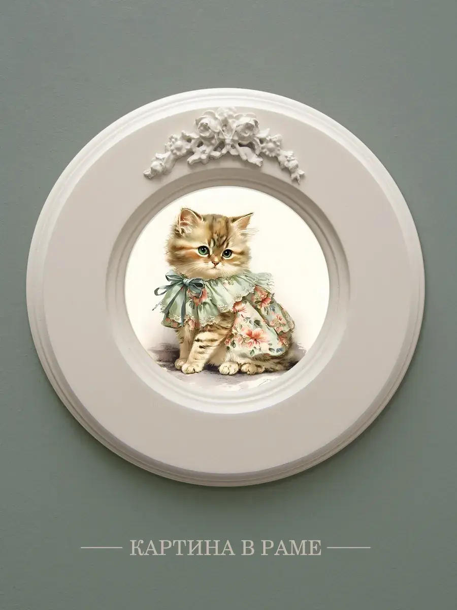 Рама с лепниной изготовлена из цельного листа МДФ 16 мм, не имеет зазоров и стыков. Окрашена экологичной акриловой эмалью в молочный цвет. Диаметр картины 17,5 см, диаметр изображения 9 см.