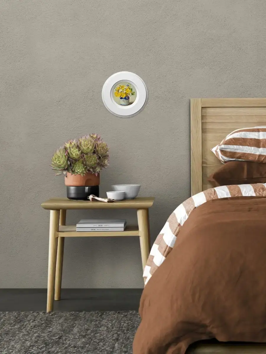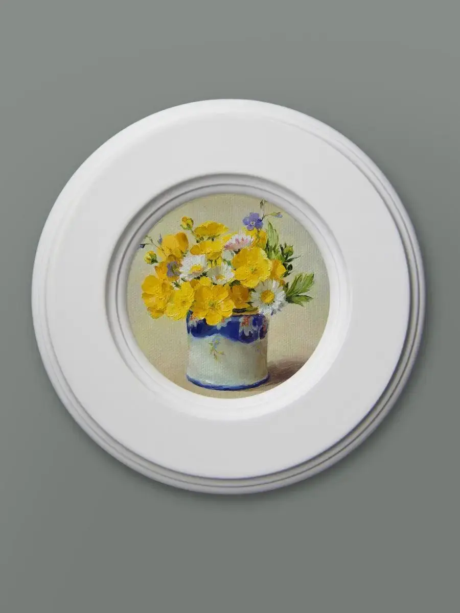 Множество вариантов дает возможность создать собственную коллекцию. Рама изготовлена из цельного листа МДФ 16 мм, не имеет зазоров и стыков. Окрашена экологичной акриловой эмалью в белый цвет. Диаметр картины 17,5 см, диаметр изображения 9 см. Крепление для стены и установки на стол в комплекте.