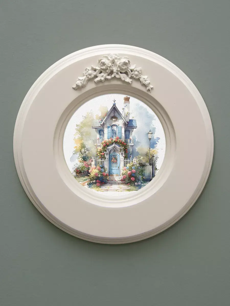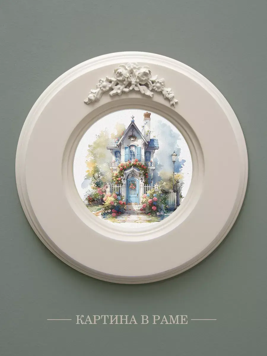 Рама с лепниной изготовлена из цельного листа МДФ 16 мм, не имеет зазоров и стыков. Окрашена экологичной акриловой эмалью в молочный цвет. Диаметр картины 17,5 см, диаметр изображения 9 см.