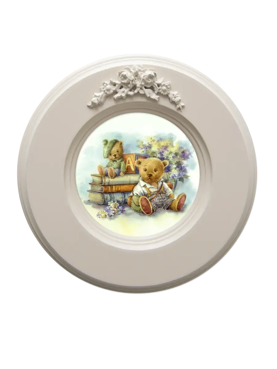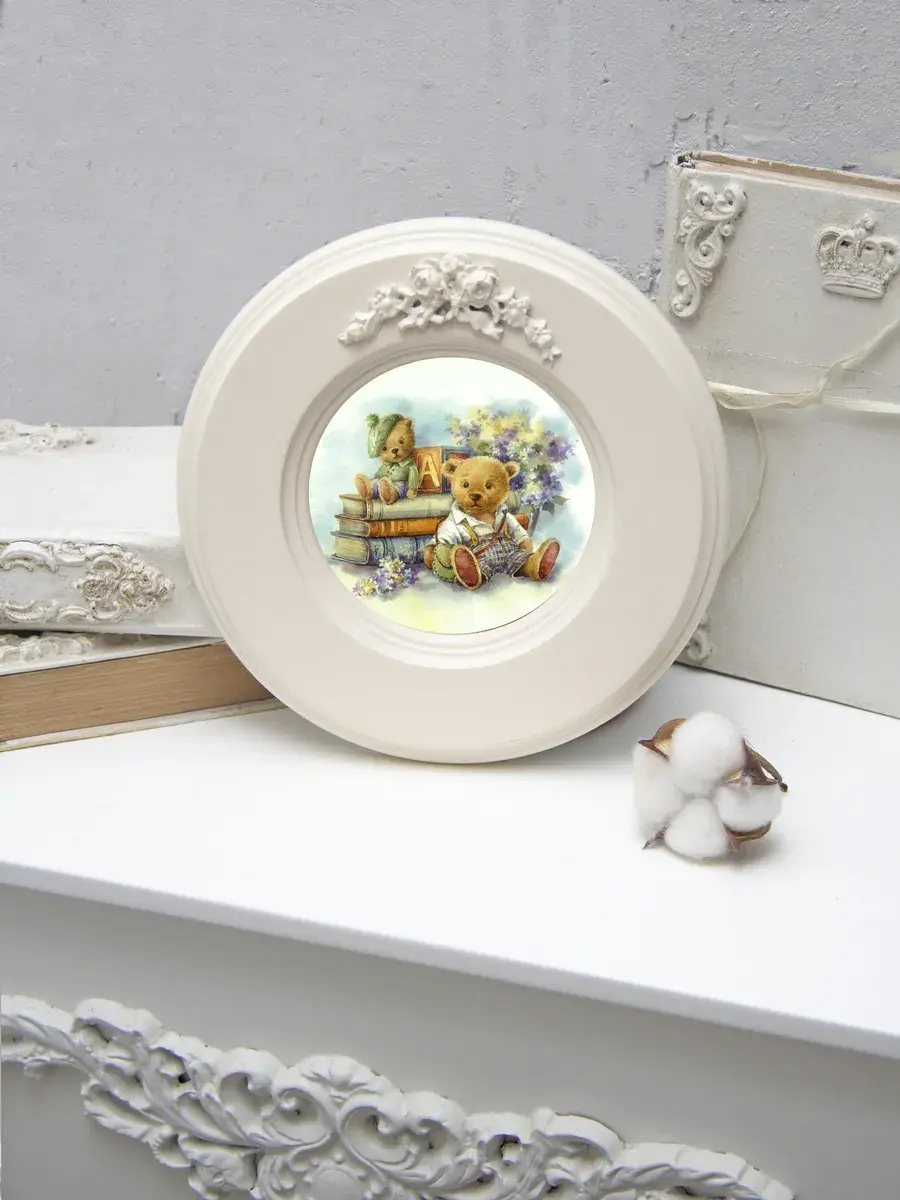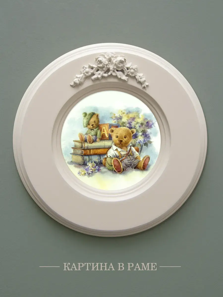 Рама с лепниной изготовлена из цельного листа МДФ 16 мм, не имеет зазоров и стыков. Окрашена экологичной акриловой эмалью в молочный цвет. Диаметр картины 17,5 см, диаметр изображения 9 см.