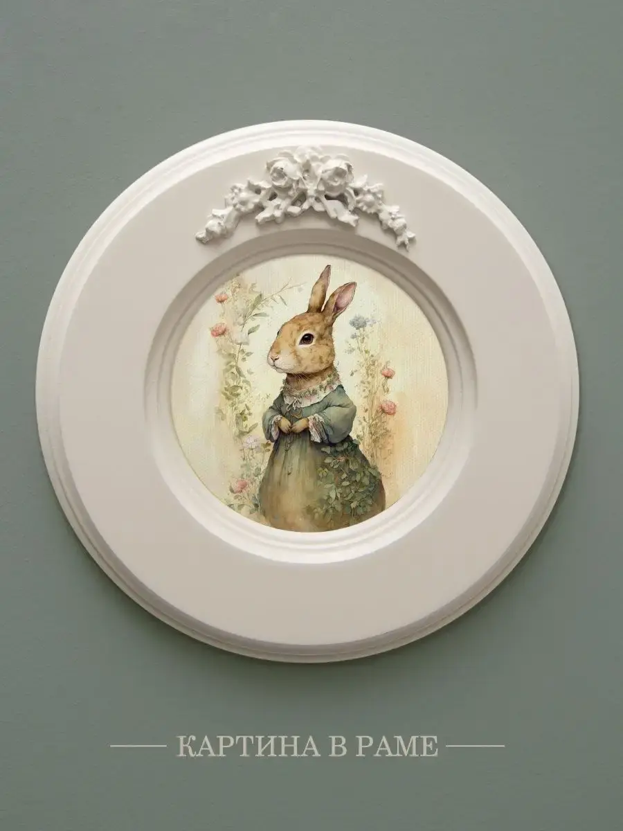 Рама с лепниной изготовлена из цельного листа МДФ 16 мм, не имеет зазоров и стыков. Окрашена экологичной акриловой эмалью в молочный цвет. Диаметр картины 17,5 см, диаметр изображения 9 см.