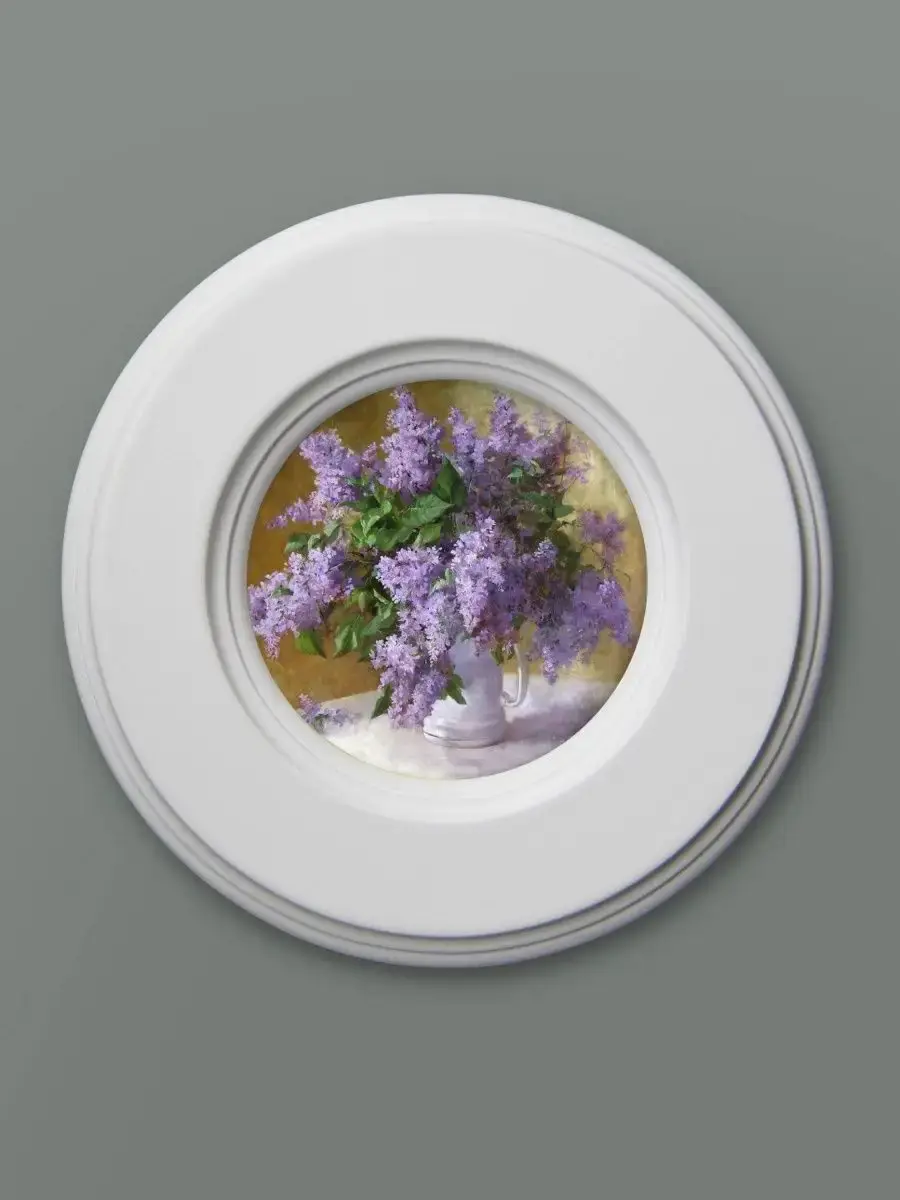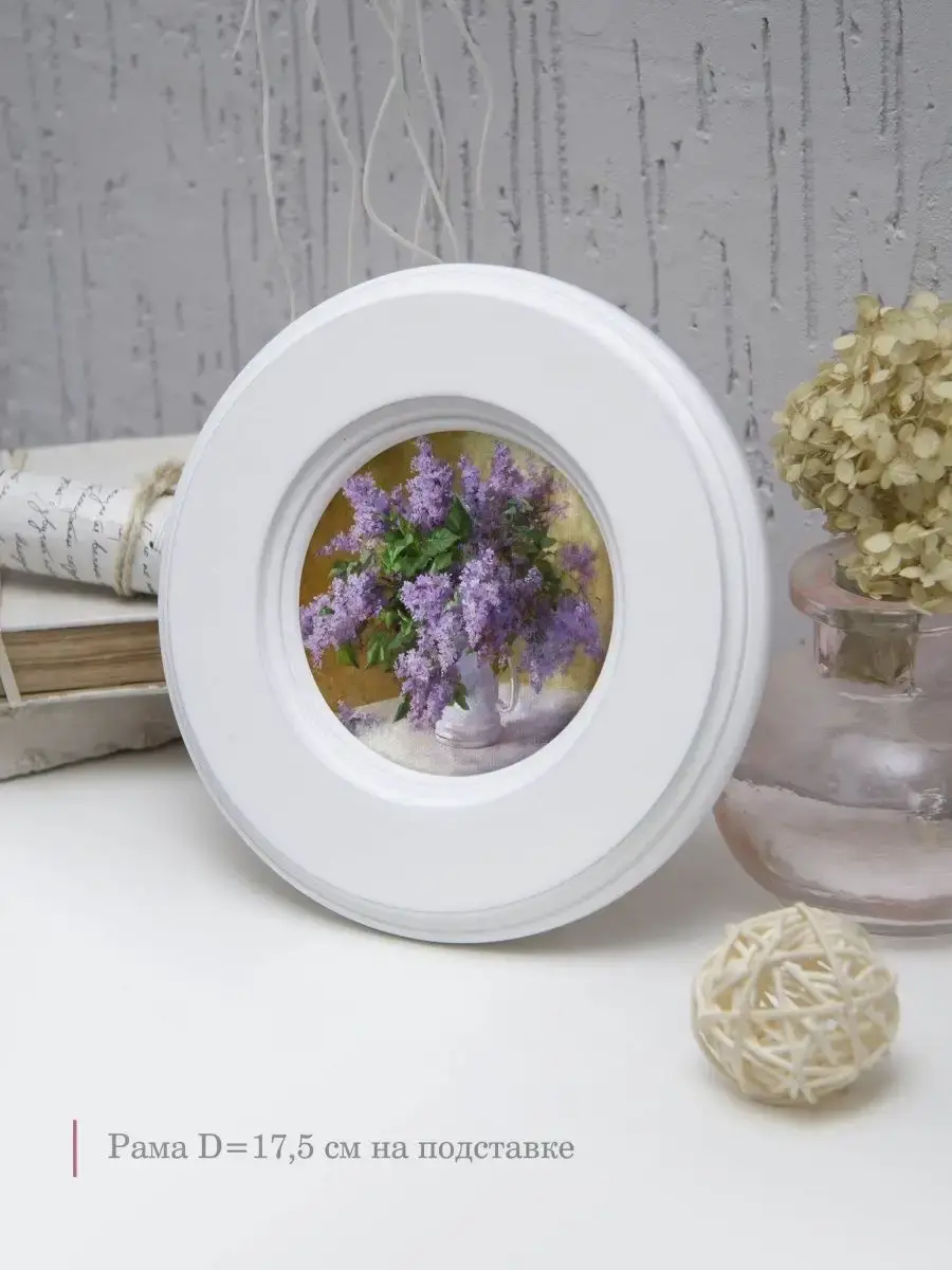 Множество вариантов дает возможность создать собственную коллекцию. Рама изготовлена из цельного листа МДФ 16 мм, не имеет зазоров и стыков. Окрашена экологичной акриловой эмалью в белый цвет. Диаметр картины 17,5 см, диаметр изображения 9 см. Крепление для стены и установки на стол в комплекте.