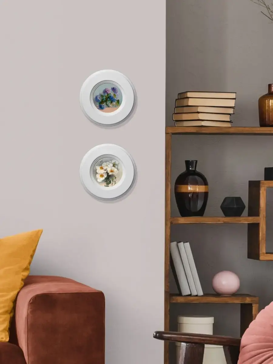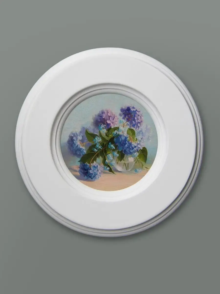 Множество вариантов дает возможность создать собственную коллекцию. Рама изготовлена из цельного листа МДФ 16 мм, не имеет зазоров и стыков. Окрашена экологичной акриловой эмалью в белый цвет. Диаметр картины 17,5 см, диаметр изображения 9 см. Крепление для стены и установки на стол в комплекте.