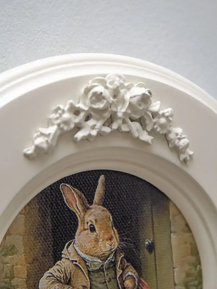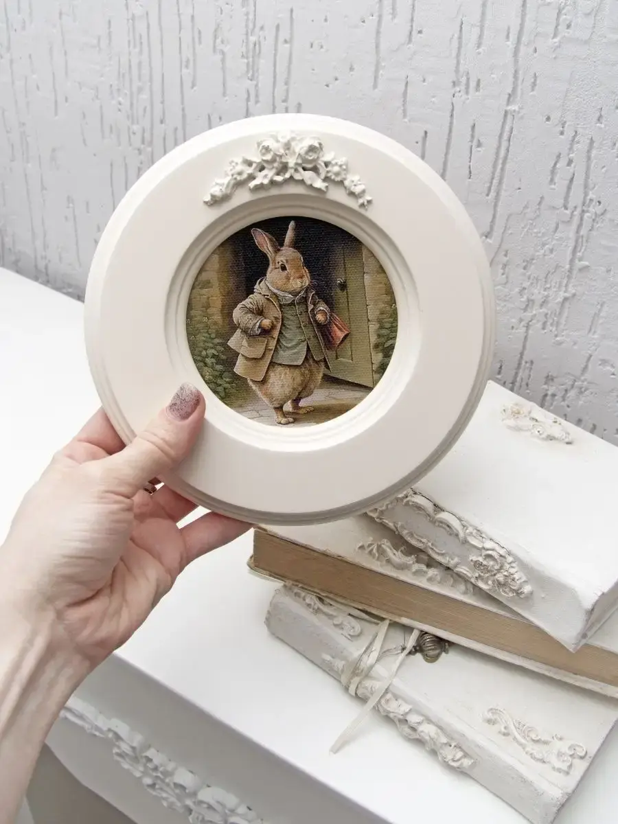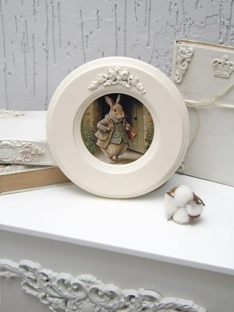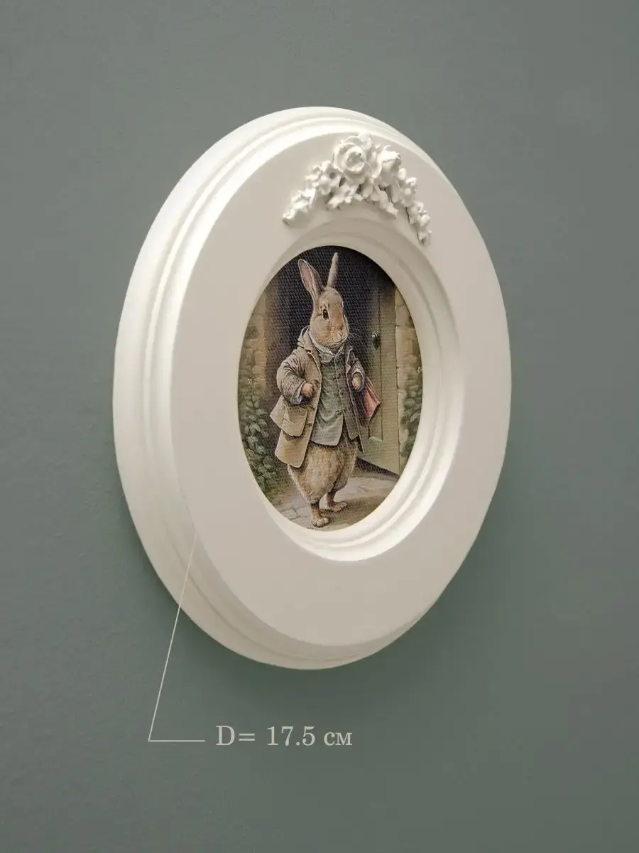 Рама с лепниной изготовлена из цельного листа МДФ 16 мм, не имеет зазоров и стыков. Окрашена экологичной акриловой эмалью в молочный цвет. Диаметр картины 17,5 см, диаметр изображения 9 см.