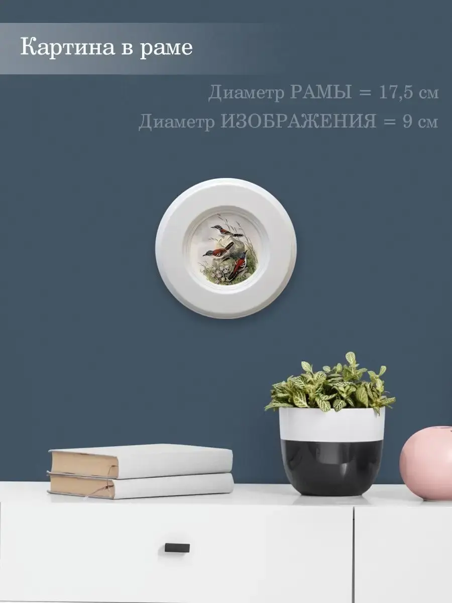 Картина напечатана на натуральном холсте, покрыта матовым лаком в круглой белой раме станет прекрасным украшением интерьера. Множество вариантов дает возможность создать собственную коллекцию. Рама изготовлена из цельного листа МДФ 16 мм, не имеет зазоров и стыков. Окрашена экологичной акриловой эмалью в белый цвет. Диаметр картины 17,5 см, диаметр изображения 9 см. Крепление для стены и для установки на стол в комплекте.