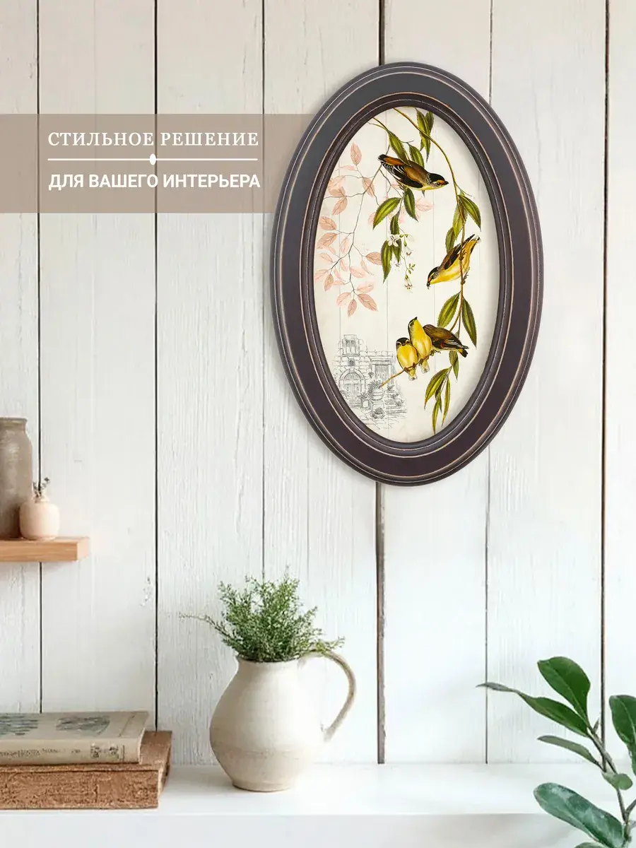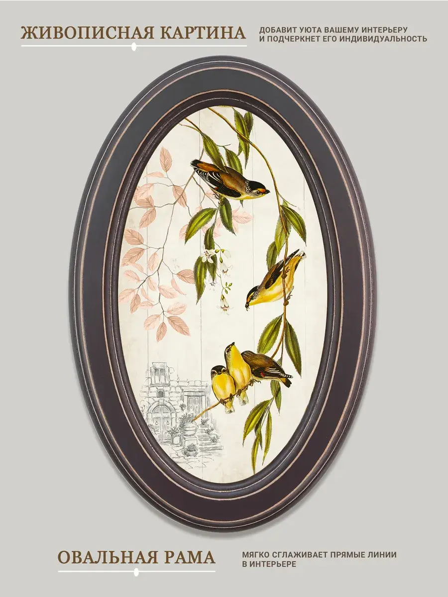 Настенный декор в нежных пастельный тонах. Картина напечатана на натуральном холсте, покрыта матовым лаком, оформлена в овальную коричневую раму с эффектом состаривания.