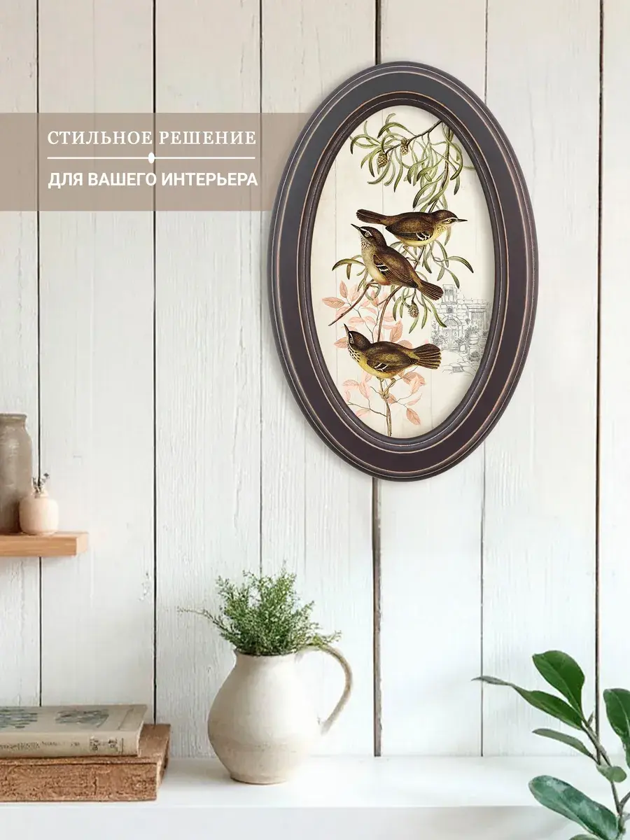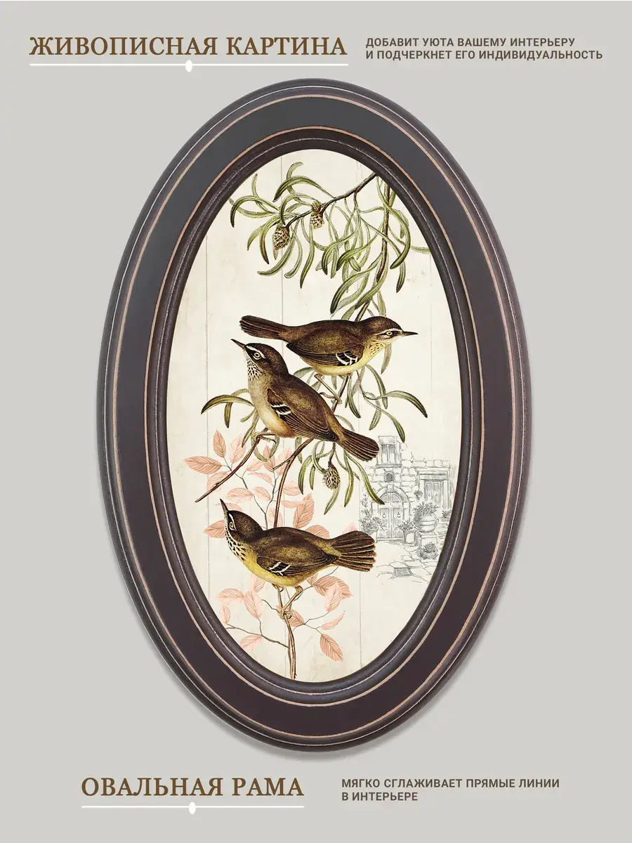 Настенный декор в нежных пастельный тонах. Картина напечатана на натуральном холсте, покрыта матовым лаком, оформлена в овальную коричневую раму с эффектом состаривания.