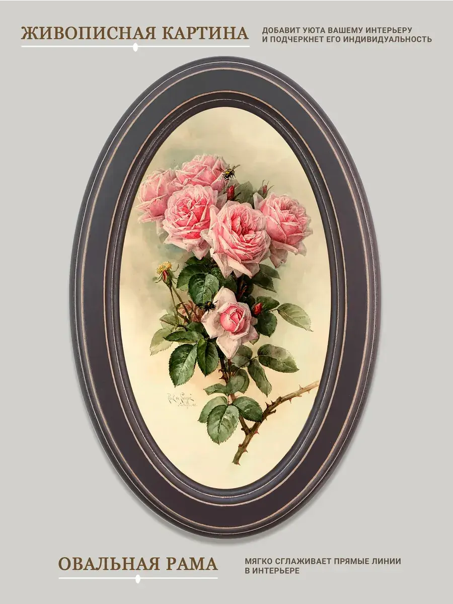 Настенный декор в нежных пастельный тонах. Картина напечатана на натуральном холсте, покрыта матовым лаком, оформлена в овальную коричневую раму с эффектом состаривания.