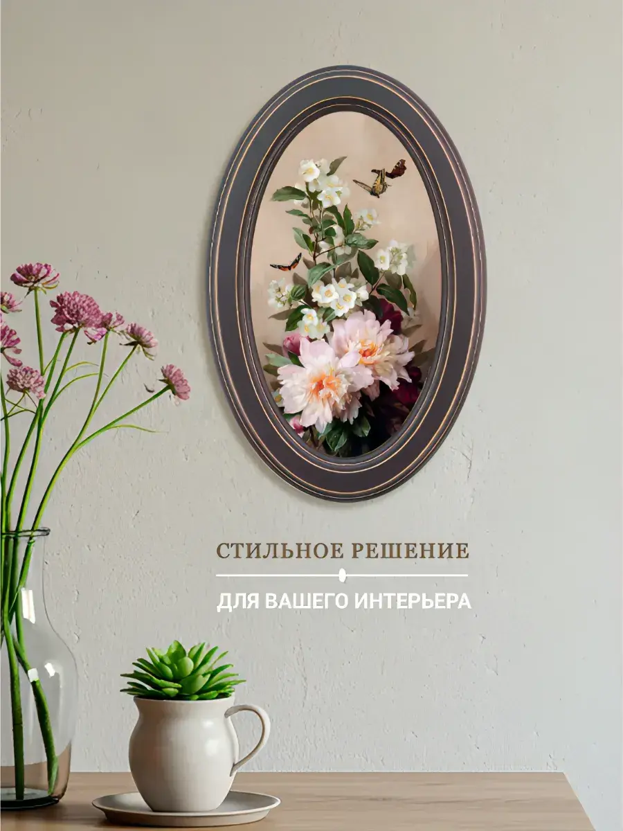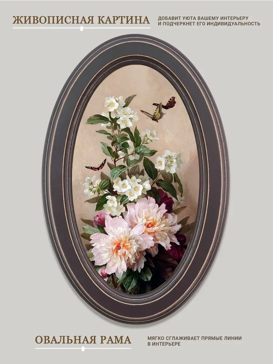 Настенный декор в нежных пастельный тонах. Картина напечатана на натуральном холсте, покрыта матовым лаком, оформлена в овальную коричневую раму с эффектом состаривания.