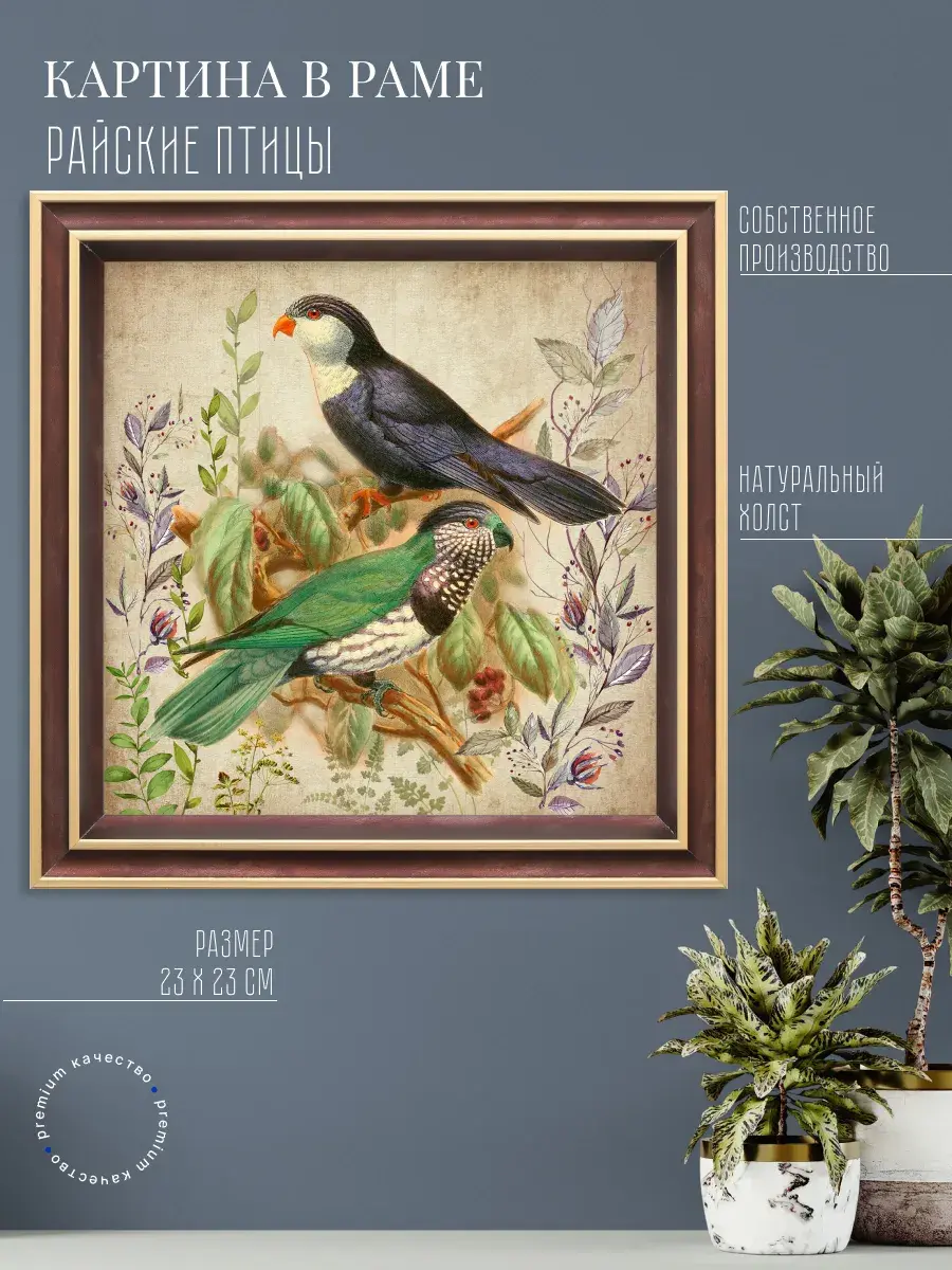 Чудесная картина, напечатанная на натуральном холсте, станет центром притяжения внимания в вашем доме. Райские птички привнесут в ваш интерьер ощущение покоя и умиротворенности.